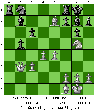 Last move : 1-0 2018 March 30 6:41:18 [Event "FICGS__CHESS__WCH_STAGE_1_GROUP_03__000019"] [Site "FICGS"] [Date "2018.03.02"] [Round "1"] [White "Zemlyanov,Sergey"] [Black "Churyaev,Alexey"] [Result "1-0"] [WhiteElo "1356"] [BlackElo "1800"] 1.d4 Nf6 2.c4 g6 3.Nc3 d5 4.cxd5 Nxd5 5.e4 Nxc3 6.bxc3 c6 7.Nf3 Bg7 8.Be2 Qa5 9.Qb3 b5 10.a4 a6 11.O-O Bb7 12.axb5 Qxa1 13.Ng5 O-O 14.Ba3 Qxf1+ 15.Bxf1 axb5 16.Bxe7 1-0 King's Indian defense, 3.Nc3 Kingside Castling by player White (move 11) Kingside Castling by player Black (move 13) Player White won this chess game. Follow this game move after move (download)The passed pawn is a criminal, who should be kept under lock and key. Mild measures, such as police surveillance, are not sufficient. (Nimzovitch) Smyslow ist ein Beweis dafür, dass ich noch zehn Jahre spielen kann! [der 75 jährige über den 85 jährigen] (Viktor Kortschnoi) Bobby es la celebridad menos entendida y malinterpretada que camina el la faz de esta tierra. (Yasser Seirawan) Mon pion favori sur ma case favorite ! Bronstein en parlant d'un coup de pion en h5 quand il avait les Noirs. Information on the Internet is subject to the same rules and regulations as conversation at a bar. (George Lundberg)