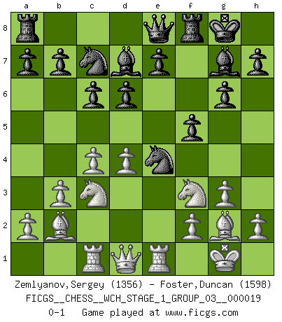 Last move : 0-1 2018 April 29 22:3:1 [Event "FICGS__CHESS__WCH_STAGE_1_GROUP_03__000019"] [Site "FICGS"] [Date "2018.03.02"] [Round "1"] [White "Zemlyanov,Sergey"] [Black "Foster,Duncan"] [Result "0-1"] [WhiteElo "1356"] [BlackElo "1598"] 1.d4 f5 2.g3 g6 3.Bg2 Bg7 4.Nf3 Nf6 5.O-O O-O 6.c4 d6 7.Nc3 Qe8 8.b3 Na6 9.Bb2 c6 10.Re1 Nc7 11.Rc1 Bd7 12.e4 Nxe4 0-1 This chess game has been lost on time (started : 2018.03.02 0:49:21) Dutch defense Kingside Castling by player White (move 5) Kingside Castling by player Black (move 5) Player Black won this chess game. Follow this game move after move (download)Castle early and often. (Rob Sillars) Ivan Sokolov treibt mich als Beifahrer an mit go Loeky go - . (Loek van Wely) Personalmente, yo prefiero mirar hacia el futuro en donde un programa de computadora gane el título mundial de Ajedrez. La humanidad necesita una lección de humildad. (Richard Dawkings) Vouloir jouer aux échecs contre soi-même est aussi paradoxal que vouloir marcher sur son ombre. (Stefan Zweig) He who laughs last probably does not get the joke. (Unknown)