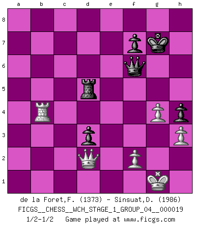 Last move : 1/2-1/2 2018 September 8 12:22:13 [Event "FICGS__CHESS__WCH_STAGE_1_GROUP_04__000019"] [Site "FICGS"] [Date "2018.03.02"] [Round "1"] [White "de la Foret,Fred"] [Black "Sinsuat,Datuali"] [Result "1/2-1/2"] [WhiteElo "1373"] [BlackElo "1986"] 1.e4 c6 2.Nc3 d6 3.Nf3 Nd7 4.d4 Qc7 5.Be2 Ngf6 6.O-O e5 7.a4 Be7 8.Nh4 exd4 9.Qxd4 Nc5 10.Nf5 Bxf5 11.exf5 d5 12.Bf4 Bd6 13.Qe3+ Kd8 14.Bxd6 Qxd6 15.b4 Ncd7 16.b5 Re8 17.Qf3 Ke7 18.a5 a6 19.bxc6 bxc6 20.Na4 Kf8 21.Nb6 Nxb6 22.axb6 Rab8 23.Rxa6 Qc5 24.c4 dxc4 25.b7 Nd5 26.Ra4 c3 27.Ba6 c2 28.Rc1 Nb4 29.g3 Qd6 30.Kg2 c5 31.Bb5 Red8 32.Ra8 Qd2 33.Rxb8 Rxb8 34.Qe4 Qd4 35.Qe2 Qd5+ 36.Kg1 Qxb7 37.Ba4 Qd5 38.Re1 c1Q 39.Qe7+ Kg8 40.Rxc1 Nd3 41.Rf1 h5 42.Bc2 c4 43.f6 gxf6 44.Qxf6 Re8 45.Qh6 Re6 46.Qd2 h4 47.h3 Qd4 48.Bxd3 cxd3 49.g4 Re5 50.Rb1 Kh7 51.Rd1 Kg7 52.Rb1 Kg6 53.Rb3 Rd5 54.Rb2 Kg7 55.Rb3 Qa1+ 56.Kg2 Qa6 57.Rb8 Qc6 58.Qb2+ Rd4 59.Kg1 Qf6 60.Qd2 Rd5 61.Kg2 Qd4 62.Rb3 Qe4+ 63.Kg1 Qd4 64.Rb8 Qc5 65.Rb7 Qd6 66.Rb4 Qf6 67.Rb3 Qh6 68.Qc3+ Qf6 69.Qd2 Qd6 70.Rb4 Qh6 71.Qc3+ Qf6 72.Qd2 1/2-1/2 Caro-Kann defense Kingside Castling by player White (move 6) Promotion Queen by player Black (move 38) This chess game ended in a draw. Follow this game move after move (download)I have always a slight feeling of pity for the man who has no knowledge of Chess. (Siegbert Tarrasch) Im Schach gibt es keinen Platz für Galanterie. (Irving Chernev) Nunca nadie ha ganado una partida de Ajedrez rindiendose. (Unknown) La solitude du joueur d'Echecs à l'approche du mat est semblable à celle du condamné. (Francis Szpiner) Life is pain my dear and anyone who says otherwise is selling something. (Princess Bride)