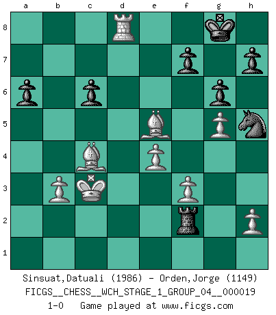 Last move : 1-0 2018 April 27 11:49:51 [Event "FICGS__CHESS__WCH_STAGE_1_GROUP_04__000019"] [Site "FICGS"] [Date "2018.03.02"] [Round "1"] [White "Sinsuat,Datuali"] [Black "Orden,Jorge"] [Result "1-0"] [WhiteElo "1986"] [BlackElo "1149"] 1.e4 c5 2.Nf3 d6 3.d4 cxd4 4.Nxd4 Nf6 5.Nc3 a6 6.Be3 e6 7.f3 Be7 8.Qd2 O-O 9.g4 Nc6 10.O-O-O Nxd4 11.Qxd4 e5 12.Qd2 Qc7 13.g5 Nh5 14.Nd5 Qd8 15.Nxe7+ Qxe7 16.Qxd6 Qxd6 17.Rxd6 Be6 18.Rb6 Rab8 19.Bc5 Rfd8 20.Bd6 Rbc8 21.Bxe5 Bxa2 22.b3 Rc6 23.Rxc6 bxc6 24.Bc4 g6 25.Kb2 Bxb3 26.cxb3 Rd2+ 27.Kc3 Ra2 28.Rd1 Rf2 29.Rd8+ 1-0 Sicilian : Najdorf, Byrne (English) attack Kingside Castling by player Black (move 8) Queenside Castling by player White (move 10) Player White won this chess game. Follow this game move after move (download)In Fischer's hands, a slight theoretical advantage is as good a being a Queen ahead. (Isaac Kashdan) Der Umstand, daß uns eine 7 Stunden Zeitkontrolle ermöglicht eine großartige, tiefe Partie zu spielen, ist für die Massenmedien nicht weiter von Bedeutung. (Alexej Shirov) Un mal día en el Ajedrez, es mejor que cualquier buen día en el trabajo. (Anonymous) Ce qui est bien, c'est d'avoir tout un tas de pièces en prise : l'adversaire ne peut en prendre qu'une à la fois. Cité par Thierry Audin. They misunderestimated me. (George W. Bush, Bentonville nov. 6, 2000)
