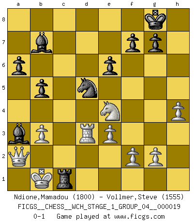Last move : 0-1 2018 April 25 21:57:53 [Event "FICGS__CHESS__WCH_STAGE_1_GROUP_04__000019"] [Site "FICGS"] [Date "2018.03.02"] [Round "1"] [White "Ndione,Mamadou"] [Black "Vollmer,Steve"] [Result "0-1"] [WhiteElo "1800"] [BlackElo "1555"] 1.d4 d5 2.c4 e6 3.Nc3 Nf6 4.Bg5 Nbd7 5.Nf3 Be7 6.e3 O-O 7.Bd3 a6 8.h4 dxc4 9.Bxc4 b5 10.Bd3 Bb7 11.Qc2 h6 12.a3 c5 13.b3 Rc8 14.dxc5 Nxc5 15.O-O-O Nxd3+ 16.Rxd3 Bxa3+ 17.Kb1 Qe7 18.Qa2 hxg5 19.Nxg5 Rfd8 20.Rhd1 Rxd3 21.Rxd3 Nd5 22.Ne2 Qc5 23.Ne4 Qc1+ 24.Nxc1 Rxc1+ 0-1 This chess game has been lost on time (started : 2018.03.02 0:49:24) QGD : 4.Bg5 Nbd7 Kingside Castling by player Black (move 6) Queenside Castling by player White (move 15) Player Black won this chess game. Follow this game move after move (download)I thought the most common mistake [in chess] was the first one: Learning the game :P (Garvin Gray, FICGS forum) Ich habe die Schachforschung dermaßen betrieben, dass sie auf eine wissenschaftliche Basis gestellt wurde. (Mikhail Moiseyevich Botvinik) Cuando me preguntan: -¿Cual es el secreto que te hace hacer mejores movidas que tus oponentes?, Yo respondo: Me da gusto que me pregunten eso, porque, como veran, hay una simple razón. Yo pienso mis propias movidas y dejo a mi oponente que el piense las suyas. (Alexander Alekhine) J'ai vu le vaincu d'Echecs jouer des années durant dans l'espoir de la fête de la victoire. Car tu es plus riche de ce qu'elle existe si même elle n'est point pour toi. Ainsi de la perle du fond des mers. (Antoine de Saint-Exupéry) The mind is like a parachute, it only functions when its open. (Unknown)