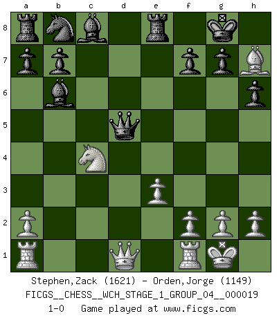 Last move : 1-0 2018 March 27 18:3:17 [Event "FICGS__CHESS__WCH_STAGE_1_GROUP_04__000019"] [Site "FICGS"] [Date "2018.03.02"] [Round "1"] [White "Stephen,Zack"] [Black "Orden,Jorge"] [Result "1-0"] [WhiteElo "1621"] [BlackElo "1149"] 1.d4 d5 2.c4 e6 3.Nc3 Nf6 4.cxd5 exd5 5.Bg5 Be7 6.e3 O-O 7.Bd3 c5 8.dxc5 h6 9.Bh4 Bxc5 10.Nf3 Re8 11.Bxf6 Qxf6 12.Nxd5 Qxb2 13.O-O Bb6 14.Nd2 Qe5 15.Nc4 Qxd5 16.Bh7+ 1-0 QGD : Exchange, positional line Kingside Castling by player Black (move 6) Kingside Castling by player White (move 13) Player White won this chess game. Follow this game move after move (download)The enormous mental resilience, without which no Chess player can exist, was so much taken up by Chess that he could never free his mind of this game. (Albert Einstein) Nie in meinem Leben habe ich die französische Verteidigung gespielt, welche die Stumpfsinnigste von allen ist. (Wilhelm Steinitz) Observen a Garry Kasparov. Después de una derrota, invariablemente el gana la próxima partida. Prácticamente hace pedazos a su siguiente oponente. Eso es algo que tenemos que aprender a lograr. (Maurice Ashley) Votre seul travail dans les ouvertures est d'obtenir un milieu de partie jouable. (Lajos Portish) Programmer - an organism that turns coffee into software. (Anonymous)