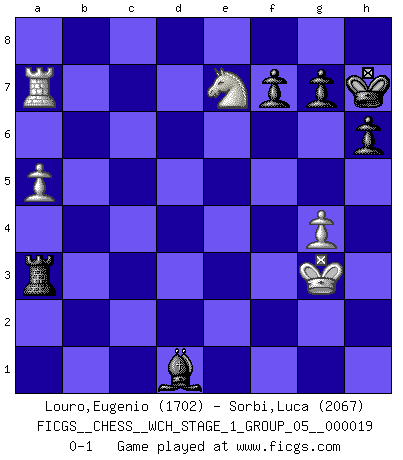 Last move : 0-1 2018 August 6 18:50:4 [Event "FICGS__CHESS__WCH_STAGE_1_GROUP_05__000019"] [Site "FICGS"] [Date "2018.03.02"] [Round "1"] [White "Louro,Eugenio"] [Black "Sorbi,Luca"] [Result "0-1"] [WhiteElo "1702"] [BlackElo "2067"] 1.e4 e5 2.Nf3 Nf6 3.Nc3 Nc6 4.Bb5 Bb4 5.d3 d6 6.O-O O-O 7.Ne2 Ne7 8.h3 c6 9.Ba4 Ng6 10.a3 Ba5 11.b4 Bc7 12.Ng3 Be6 13.c4 d5 14.Qc2 h6 15.Re1 Qc8 16.Bd2 Bxh3 17.cxd5 Bg4 18.Nh2 cxd5 19.Rac1 Bb6 20.Qa2 Qd8 21.exd5 a5 22.Bb5 Bd7 23.Bc4 Re8 24.Rb1 a4 25.Ne4 Bd4 26.b5 Nxe4 27.dxe4 Qh4 28.Be3 Qxe4 29.Bxd4 Qxd4 30.Rbd1 Qf4 31.d6 Qf6 32.Qb1 Rad8 33.Qe4 Qf4 34.Qc2 Rc8 35.Re4 Qf5 36.Qxa4 Nf4 37.Bf1 Re6 38.g3 Rg6 39.Rde1 Rc5 40.Nf3 Nh3+ 41.Bxh3 Qxh3 42.Qd1 Rc3 43.R4e3 Rxe3 44.Rxe3 Bxb5 45.Rb3 Ba4 46.d7 Qxd7 47.Qxd7 Bxd7 48.Nxe5 Rd6 49.Rxb7 Rd1+ 50.Kg2 Be6 51.f3 Rd5 52.Nc6 Rd2+ 53.Kg1 Rd3 54.a4 Rxf3 55.Kh2 Ra3 56.a5 Kh7 57.Ra7 Bd5 58.Ne7 Be4 59.g4 Bf3 60.Kg3 Bd1 0-1 Petrov Three knights game Kingside Castling by player White (move 6) Kingside Castling by player Black (move 6) Player Black won this chess game. Follow this game move after move (download)It is always better to sacrifice your opponent's men. (Savielly Tartakower) Meine Liebe ist Schach, Schach, Schach. Ich muss jeden Tag Schach spielen, deshalb fühle ich mich so stark. (Miguel Najdorf) No soy una persona materialista y por eso, no resiento la falta o pérdida del dinero. La ausencia de cosas mundanas carece de importancia. Ya que el Ajedrez es una forma en la que puedo ser tan materialista como yo desee sin tener la necesidad de vender mi alma. (Jamie Walter Adams) Votre prénom est 'Tactique', votre deuxième prénom est 'Tactique' et votre nom est 'Tactique'. (Ken Smith) When I took office, only high energy physicists had ever heard of what is called the World Wide Web... Now even my cat has its own page. (Bill Clinton, 1996)