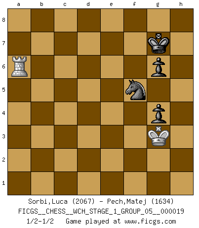 Last move : 1/2-1/2 2018 August 23 23:25:48 [Event "FICGS__CHESS__WCH_STAGE_1_GROUP_05__000019"] [Site "FICGS"] [Date "2018.03.02"] [Round "1"] [White "Sorbi,Luca"] [Black "Pech,Matej"] [Result "1/2-1/2"] [WhiteElo "2067"] [BlackElo "1634"] 1.d4 Nf6 2.c4 c5 3.d5 b5 4.cxb5 a6 5.bxa6 Bxa6 6.Nc3 g6 7.e4 Bxf1 8.Kxf1 d6 9.Nf3 Bg7 10.g3 O-O 11.Kg2 Nbd7 12.Re1 Qb6 13.h3 Rfb8 14.Re2 Qa6 15.Bg5 h6 16.Be3 Nb6 17.Rc1 Nc4 18.b3 Nxe3+ 19.Rxe3 Nd7 20.Rc2 Rb4 21.Ne2 h5 22.Nd2 Bd4 23.Nxd4 cxd4 24.Re1 Nc5 25.Nc4 d3 26.Rd2 Rxc4 27.bxc4 Qxc4 28.Qc1 Qxc1 29.Rxc1 Nxe4 30.Rxd3 Rxa2 31.Rf3 f5 32.g4 fxg4 33.hxg4 hxg4 34.Re3 Rxf2+ 35.Kg1 Rf4 36.Rc4 Rf1+ 37.Kxf1 Nd2+ 38.Kf2 Nxc4 39.Rxe7 Nb6 40.Re6 Nxd5 41.Rxd6 Ne7 42.Ra6 Kg7 43.Kg3 Nf5+ 1/2-1/2 Benko gambit accepted Kingside Castling by player Black (move 10) 10 pieces endgame at move 37 : White KRRP , Black KNPPPP WHITE : King + 2 Rooks 1 Pawn BLACK : King + 1 Knight 4 Pawns 9 pieces endgame at move 38 : White KRP , Black KNPPPP WHITE : King + 1 Rook 1 Pawn BLACK : King + 1 Knight 4 Pawns 8 pieces endgame at move 39 : White KRP , Black KNPPP WHITE : King + 1 Rook 1 Pawn BLACK : King + 1 Knight 3 Pawns 7 pieces endgame at move 40 : White KR , Black KNPPP WHITE : King + 1 Rook BLACK : King + 1 Knight 3 Pawns 6 pieces endgame at move 41 : White KR , Black KNPP WHITE : King + 1 Rook BLACK : King + 1 Knight 2 Pawns This chess game ended in a draw. Follow this game move after move (download)The Pawns are the soul of the game. (Francois Andre Danican Philidor) Über Frauen: Chess is better. (Robert James Fischer) Aunque la mayoría de la gente disfruta observar las partidas de los grandes Maestros de ataque, algunos de los jugadores mas notables en la historia han sido los jugadores silenciosos posicionales. Lentamente ellos te aplastan despojandote de tu espacio, congestionando tus piezas y dejandote virtualmente sin nada que hacer. (Yasser Seirawan) Il n'y a plus de joueurs du niveau de Jacob Murray dont la seule quête est le beau jeu, le plaisir de voir les pièces construire quelque chose. Sur 10 idées à la minute, 9 seront sans intérêt, la dernière s'avèrera géniale. (Christian Bauer) Luck is the residue of design. (John Milton)