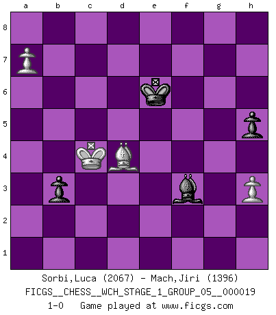 Last move : 1-0 2018 September 22 15:3:58 [Event "FICGS__CHESS__WCH_STAGE_1_GROUP_05__000019"] [Site "FICGS"] [Date "2018.03.02"] [Round "1"] [White "Sorbi,Luca"] [Black "Mach,Jiri"] [Result "1-0"] [WhiteElo "2067"] [BlackElo "1396"] 1.d4 Nf6 2.c4 e6 3.Nc3 Bb4 4.e3 O-O 5.Bd3 d5 6.Nf3 c5 7.O-O Nc6 8.a3 Bxc3 9.bxc3 dxc4 10.Bxc4 Qc7 11.Bd3 e5 12.Qc2 Re8 13.Nxe5 Nxe5 14.dxe5 Qxe5 15.f3 Bd7 16.a4 Rad8 17.e4 b6 18.Bd2 Bc6 19.Bc4 Rd7 20.Rfe1 Red8 21.Be3 Nh5 22.a5 b5 23.Bf1 Nf4 24.Qf2 Ne6 25.a6 h6 26.Rec1 g5 27.Rab1 Rd6 28.Kh1 Bd7 29.Ra1 Bc6 30.h3 Rb8 31.Ra5 Rbd8 32.Qe1 f5 33.exf5 Qxf5 34.Qg3 Qf7 35.R5a1 c4 36.Re1 Nf4 37.Qf2 R8d7 38.Rab1 Ne6 39.Kg1 Nf4 40.Rb2 Rd5 41.h4 Qf6 42.Bxa7 Qxc3 43.Be3 Rd1 44.Rxd1 Rxd1 45.Rd2 Nd3 46.Qg3 Re1 47.Re2 Rxf1+ 48.Kxf1 Qa1+ 49.Re1 Qxe1+ 50.Qxe1 Nxe1 51.Kxe1 gxh4 52.Kd2 b4 53.a7 h5 54.Bc5 b3 55.Kc3 Kf7 56.Bd4 Bd5 57.Kb4 Ke6 58.Kc5 h3 59.gxh3 Bxf3 60.Kxc4 1-0 This chess game has been lost on time (started : 2018.03.02 0:49:25) Nimzo-Indian : 4.e3 O-O, 5.Bd3 d5 Kingside Castling by player Black (move 4) Kingside Castling by player White (move 7) 10 pieces endgame at move 59 : White KBPPP , Black KBPPP WHITE : King + 1 Bishop 3 Pawns BLACK : King + 1 Bishop 3 Pawns 9 pieces endgame at move 59 : White KBPP , Black KBPPP WHITE : King + 1 Bishop 2 Pawns BLACK : King + 1 Bishop 3 Pawns 8 pieces endgame at move 60 : White KBPP , Black KBPP WHITE : King + 1 Bishop 2 Pawns BLACK : King + 1 Bishop 2 Pawns Player White won this chess game. Follow this game move after move (download)I guess a certain amount of temperament is expected of Chess geniuses. (Ron Gross) Wie gewinnt Tal? Er entwickelt alle seine Figuren in die Brettmitte und opfert sie dann irgendwo. (Robert James Fischer) No es suficiente ser un buen jugador, se debe también de jugar bién. (Siegbert Tarrasch) Je menace de comprendre la position. (Anonyme) Thus, what is of supreme importance in war is to attack the enemy's strategy. (Sun Tzu)