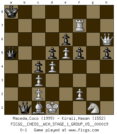 Last move : 0-1 2018 July 23 6:47:12 [Event "FICGS__CHESS__WCH_STAGE_1_GROUP_05__000019"] [Site "FICGS"] [Date "2018.03.02"] [Round "1"] [White "Maceda,Coco"] [Black "Kirali,Hasan"] [Result "0-1"] [WhiteElo "1999"] [BlackElo "1552"] 1.e4 e6 2.d4 d5 3.Nc3 Bb4 4.e5 c5 5.a3 Bxc3+ 6.bxc3 Qa5 7.Bd2 Qa4 8.Qg4 Kf8 9.h4 Ne7 10.h5 h6 11.Rh3 Nbc6 12.Qf4 c4 13.Rf3 Nd8 14.Kd1 a5 15.Ne2 b5 16.Bc1 Ke8 17.Rb1 Rb8 18.g4 Rb7 19.Bh3 Rh7 20.Rg3 Kd7 21.Qe3 g6 22.hxg6 fxg6 23.Rf3 Kc7 24.Rf6 Kb8 25.Bg2 h5 26.g5 Nf5 27.Qf4 Rhg7 28.Bh3 Nc6 29.Bxf5 gxf5 30.g6 b4 31.axb4 Qa2 32.Rb2 Qa1 33.b5 a4 34.Rf7 a3 35.bxc6 axb2 36.cxb7 Rxg6 37.bxc8Q+ Kxc8 38.Rf6 Rg1+ 39.Nxg1 b1Q 40.Qh6 Qa5 41.Rf8+ Kb7 42.Rf7+ Ka8 0-1 French : Winawer, Advance variation Promotion Queen by player White (move 37) Promotion Queen by player Black (move 39) Player Black won this chess game. Follow this game move after move (download)It is peculiar but a fact nevertheless, that gamblers in chess always have enthusiastic followers. (Botvinnik) Wenn man heute mit 14 Jahren noch kein GM ist, kann man es vergessen. (Viswanathan Anand) A través de las casillas del tablero, los Indios explican el movimiento del tiempo y la edad, las influencias mas altas que controlan el mundo y los lazos que vinculan al Ajedrez con el alma humana. (Al-Masudi) Il a essayé de se convaincre qu'il pourrait empêcher toutes les erreurs et ne jamais perdre. L'horreur ! Gary Kasparov au sujet de Robert Fischer. Tomorrow's what you make of it. (Horatio Caine, C.S.I. Miami)