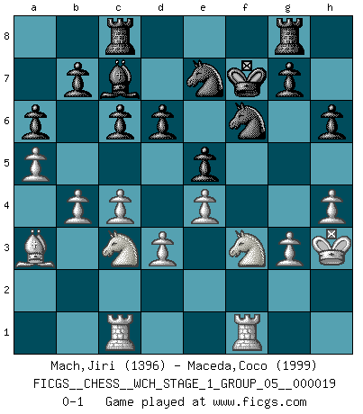 Last move : 0-1 2018 July 24 16:11:11 [Event "FICGS__CHESS__WCH_STAGE_1_GROUP_05__000019"] [Site "FICGS"] [Date "2018.03.02"] [Round "1"] [White "Mach,Jiri"] [Black "Maceda,Coco"] [Result "0-1"] [WhiteElo "1396"] [BlackElo "1999"] 1.c4 e5 2.Nc3 Nf6 3.Nf3 Nc6 4.g3 Bc5 5.Bg2 d6 6.O-O O-O 7.d3 a6 8.a3 h6 9.b4 Ba7 10.Bb2 Bg4 11.h3 Be6 12.Rc1 Qd7 13.Kh2 Rad8 14.Qa4 Ne7 15.Qxd7 Nxd7 16.a4 f5 17.Nd2 c6 18.Ba3 Ra8 19.a5 Bb8 20.e3 Re8 21.Rfe1 Bc7 22.h4 Rac8 23.Bh3 Kf7 24.e4 f4 25.Nf3 Bxh3 26.Kxh3 fxg3 27.fxg3 Rg8 28.Rf1 Nf6 0-1 English Opening Kingside Castling by player White (move 6) Kingside Castling by player Black (move 6) Player Black won this chess game. Follow this game move after move (download)My opponents make good moves too. Sometimes I don't take these things into consideration. (Bobby Fischer) Mit Schach schule ich mein Gefühl für Geometrie, was für Tennis und Schach gleichermaßen wichtig ist. (Boris Becker) Estaba muy claro de que el punto vulnerable del Gran Maestro Americano (Bobby Fischer) radicaba en las posiciones de doble filo, colgantes, irracionales, donde el siempre falló en encontrar un triunfo aún en una posición de clara victoria. (Efim Geller) Pour se monter efficace, un Cavalier a besoin d'avant-postes ! Les Cavaliers font les meilleurs bloqueurs de pions passés. The large trees attract high winds. (Chinese proverb)