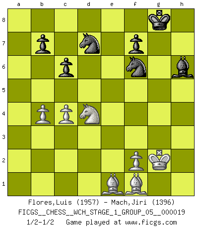 Last move : 1/2-1/2 2018 June 28 17:59:19 [Event "FICGS__CHESS__WCH_STAGE_1_GROUP_05__000019"] [Site "FICGS"] [Date "2018.03.02"] [Round "1"] [White "Flores,Luis"] [Black "Mach,Jiri"] [Result "1/2-1/2"] [WhiteElo "1957"] [BlackElo "1396"] 1.e4 Nf6 2.e5 Nd5 3.d4 d6 4.Nf3 dxe5 5.Nxe5 c6 6.Bd3 Nd7 7.Nf3 N7f6 8.a3 Bg4 9.h3 Bxf3 10.Qxf3 g6 11.O-O Bg7 12.Re1 O-O 13.Bf1 Re8 14.c4 Nb6 15.Be3 e5 16.dxe5 Rxe5 17.Nd2 Qe7 18.b4 Nbd7 19.Qd1 Re8 20.Nf3 Re6 21.Bxa7 Rxe1 22.Qxe1 Qxe1 23.Rxe1 Ra8 24.Be3 Rxa3 25.Rd1 Bf8 26.g4 h6 27.h4 g5 28.hxg5 hxg5 29.Kg2 Ra2 30.Bxg5 Nxg4 31.Rd2 Rxd2 32.Bxd2 Bh6 33.Be1 Ngf6 34.Nd4 1/2-1/2 Alekhine's defense : Modern, Larsen variation Kingside Castling by player White (move 11) Kingside Castling by player Black (move 12) This chess game ended in a draw. Follow this game move after move (download)If one piece is badly posted, the whole game is bad. (Tarrasch) Frage: Gibt es etwas was Sie mehr lieben als Autobahnen ohne Tempobegrenzungen? - Antwort: Deutsche Frauen ohne Tempobegrenzungen. (Loek van Wely) Aunque la mayoría de la gente disfruta observar las partidas de los grandes Maestros de ataque, algunos de los jugadores mas notables en la historia han sido los jugadores silenciosos posicionales. Lentamente ellos te aplastan despojandote de tu espacio, congestionando tus piezas y dejandote virtualmente sin nada que hacer. (Yasser Seirawan) 'L'échange des dames est un coup dur pour les deux adversaires...' Un journaliste lors d'une partie du match Spassky-Fischer It's only after you lost everything, Tyler says, that you're free to do anything. (Chuck Palahniuk, Fight Club)