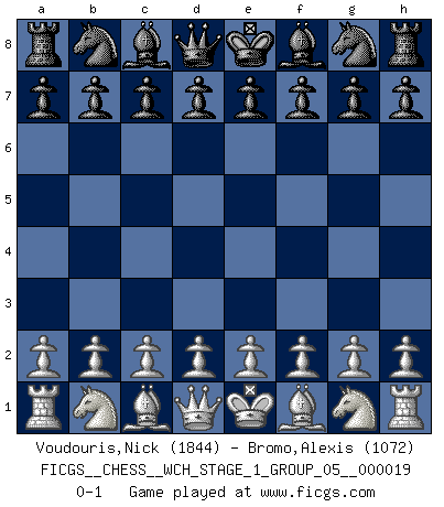 Last move : 0-1 2018 April 22 21:35:23 [Event "FICGS__CHESS__WCH_STAGE_1_GROUP_05__000019"] [Site "FICGS"] [Date "2018.03.23"] [Round "1"] [White "Voudouris,Nick"] [Black "Bromo,Alexis"] [Result "0-1"] [WhiteElo "1844"] [BlackElo "1072"] 0-1 This chess game has been lost on time (started : 2018.03.23 18:23:33) Player Black won this chess game. Follow this game move after move (download)You are for me the Queen on d8 and I am the Pawn on d7 !! (Eduard Gufeld) Es ist besser die Steine des Gegners zu opfern. (Savielly Grigorievitsch Tartakower) Dejen al perfeccionista jugar por correo. (Yasser Seirawan) La victoire dans une partie d'Echecs appartient la plupart du temps à celui qui voit un peu plus loin que l'adversaire. (Lasker) Fear is the path to the dark side. Fear leads to anger; anger leads to hate; hate leads to suffering. I sense much fear in you. (Master Yoda in Star Wars ep.1)