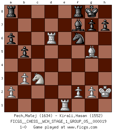Last move : 1-0 2018 July 18 20:3:43 [Event "FICGS__CHESS__WCH_STAGE_1_GROUP_05__000019"] [Site "FICGS"] [Date "2018.03.02"] [Round "1"] [White "Pech,Matej"] [Black "Kirali,Hasan"] [Result "1-0"] [WhiteElo "1634"] [BlackElo "1552"] 1.d4 d5 2.c4 c6 3.Nf3 Nf6 4.Nc3 e6 5.e3 Nbd7 6.Bd3 dxc4 7.Bxc4 b5 8.Bd3 Bb7 9.O-O a6 10.e4 c5 11.d5 Qc7 12.dxe6 fxe6 13.Bc2 c4 14.Ng5 Nc5 15.e5 Qxe5 16.Re1 Qd6 17.Qxd6 Bxd6 18.Be3 Nd3 19.Bxd3 cxd3 20.Rad1 O-O 21.Rxd3 Bd5 22.Nxe6 Bxh2+ 23.Kxh2 Bxe6 24.Rd6 Bc4 25.b3 Bf7 26.Bg5 1-0 This chess game has been lost on time (started : 2018.03.02 0:49:25) QGD Slav : 4.Nc3 Kingside Castling by player White (move 9) Kingside Castling by player Black (move 20) Player White won this chess game. Follow this game move after move (download)Though most people love to look at the games of the great attacking masters, some of the most successful players in history have been the quiet positional players. They slowly grind you down by taking away your space, tying up your pieces, and leaving you with virtually nothing to do ! (Yasser Seirawan) Wer der Ansicht ist, daß alle Schachspieler verrückt sind, wird durch Studium des Lebens von Emil Josef Diemer nicht auf andere Gedanken kommen. (Hans Ree) El Ajedrez, como cualquier actividad creativa, solo puede existir a través del esfuerzo combinado de aquellos que tienen talento creativo y de aquellos que poseen la habilidad de organizar su trabajo creativo. (Mikhail Botvinnik) Même si vous avez un bon coup à faire, regardez toujours s'il n'y en a pas un qui lui soit préférable. (Pedro Damiano) He who laughs last probably does not get the joke. (Unknown)
