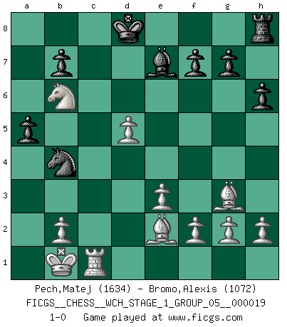 Last move : 1-0 2018 July 16 16:44:32 [Event "FICGS__CHESS__WCH_STAGE_1_GROUP_05__000019"] [Site "FICGS"] [Date "2018.03.23"] [Round "1"] [White "Pech,Matej"] [Black "Bromo,Alexis"] [Result "1-0"] [WhiteElo "1634"] [BlackElo "1072"] 1.c4 e5 2.Nc3 Nf6 3.Nf3 d6 4.d4 h6 5.dxe5 Nfd7 6.Bf4 dxe5 7.Nxe5 Nxe5 8.Qxd8+ Kxd8 9.Bxe5 Nc6 10.O-O-O Bd7 11.Bg3 a5 12.Nb5 Kc8 13.Nxc7 Ra7 14.Nb5 Ra8 15.e3 Bc5 16.Rd5 Be7 17.Be2 Be6 18.Nc7 Bxd5 19.cxd5 Nb4 20.Nxa8 Nxa2+ 21.Kb1 Nb4 22.Rc1+ Kd8 23.Nb6 1-0 English Opening Queenside Castling by player White (move 10) Player White won this chess game. Follow this game move after move (download)My style is somewhere between that of Tal and Petrosian. (Reshevsky) Schach ist ein schwarz-weisser Dschungel. (Garry Kasparov) Del Ajedrez se ha dicho que la vida no es lo suficientemente larga para él, pero eso es culpa de la vida, no del Ajedrez. (William Ewart Napier) Nous vivons dans un monde échiquéen : chaque jour qui passe est un défi à relever. (Philosophe Sasha) Wisdom is the reward you get for a lifetime of listening when you'd have preferred to talk. (Doug Larson)