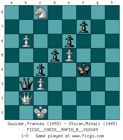 Last move : 1-0 2007 June 17 9:18:54 [Event "FICGS__CHESS__RAPID_B__000049"] [Site "FICGS"] [Date "2007.04.25"] [Round "1"] [White "Gouldar,Frances"] [Black "Stoian,Mihail"] [Result "1-0"] [WhiteElo "1493"] [BlackElo "1445"] 1.e4 e6 2.d4 d5 3.Nc3 Bb4 4.e5 c5 5.Bd2 cxd4 6.Nb5 Bxd2+ 7.Qxd2 Nc6 8.Nf3 Nge7 9.Nbxd4 O-O 10.O-O-O Bd7 11.Nxc6 bxc6 12.Bd3 h6 13.Qb4 a5 14.Qh4 c5 15.c3 a4 16.Bc2 Nc6 17.Qxd8 Rfxd8 18.h4 c4 19.g4 Rdb8 20.a3 Rb6 21.g5 Rab8 22.gxh6 gxh6 23.Rd2 Kh8 24.Bxa4 R8b7 25.Bxc6 Bxc6 26.Nd4 Bd7 27.f4 Rb8 28.Rg1 Rg8 29.Rxg8+ Kxg8 30.Rg2+ Kh8 31.Ne2 Rb8 32.Nd4 Rg8 33.Rxg8+ Kxg8 34.b4 Kg7 35.b5 Kg6 36.a4 Kh5 37.a5 Kxh4 38.a6 Bc8 39.Nc6 Kg3 40.Ne7 h5 41.Nxc8 h4 42.a7 h3 43.a8Q h2 44.b6 h1Q+ 45.Kb2 Qd1 46.Qa1 Qb3+ 47.Kc1 Kxf4 48.Qb2 1-0 French : Winawer, Advance, Bogolyubov variation Kingside Castling by player Black (move 9) Queenside Castling by player White (move 10) Promotion Queen by player White (move 43) Promotion Queen by player Black (move 44) Player White won this chess game. Follow this game move after move (download)We cannot resist the fascination of sacrifice, since a passion for sacrifices is part of a Chessplayer's nature. (Rudolf Spielman) Schach ist das Spiel, das die Verrückten gesund hält. (Albert Einstein) El Ajedrez es un juego de pelea el cual es puramente intelectual e incluye la suerte. (Richard Reti) Les échecs sont un jeu par leur forme, un art par leur essence et une science par sa difficulté d'acquisition. Ils peuvent vous procurer autant de plaisir qu'un bon livre ou une belle musique, mais vous n'aurez une réelle joie que si vous arrivez à bien jouer. (Tigran Petrosian) Good decisions come from experience, and experience comes from bad decisions. (Anonymous)