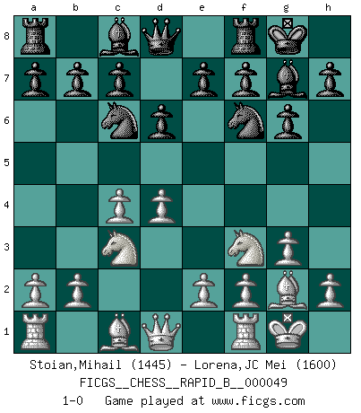 Last move : 1-0 2007 June 4 6:15:48 [Event "FICGS__CHESS__RAPID_B__000049"] [Site "FICGS"] [Date "2007.04.25"] [Round "1"] [White "Stoian,Mihail"] [Black "Lorena,JC Mei"] [Result "1-0"] [WhiteElo "1445"] [BlackElo "1600"] 1.Nf3 g6 2.c4 Nf6 3.g3 d6 4.Bg2 Bg7 5.Nc3 O-O 6.O-O Nc6 7.d4 1-0 This chess game has been lost on time (started : 2007.04.25 15:52:58) Reti Opening Kingside Castling by player Black (move 5) Kingside Castling by player White (move 6) Player White won this chess game. Follow this game move after move (download)The laws of Chess do not permit a free choice: you have to move whether you like it or not. (Emanuel Lasker) Karpov ist ein Museumsstück. (Garry Kasparov) El hombre es un frívolo, una creatura engañosa y como un jugador de Ajedrez, se preocupa mas por el proceso de obtener su meta que de la meta por sí misma. (Dostoyevsky) Les sacrifices démontrent seulement que quelqu'un a gaffé. (Savielly Tartacover) It's unlucky to be superstitious. (Dave Enteles)