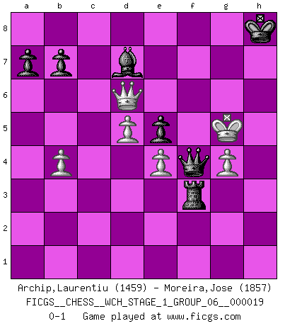 Last move : 0-1 2018 March 6 6:7:41 [Event "FICGS__CHESS__WCH_STAGE_1_GROUP_06__000019"] [Site "FICGS"] [Date "2018.03.02"] [Round "1"] [White "Archip,Laurentiu"] [Black "Moreira,Jose"] [Result "0-1"] [WhiteElo "1459"] [BlackElo "1857"] 1.c4 Nf6 2.d4 g6 3.Nf3 Bg7 4.Nc3 d6 5.e4 O-O 6.Bd3 c6 7.O-O Na6 8.a3 e5 9.d5 cxd5 10.cxd5 Nc5 11.b4 Nxd3 12.Qxd3 Bd7 13.Bg5 h6 14.Bxf6 Bxf6 15.Nb5 Qb6 16.Nc3 Rac8 17.Rfc1 Be7 18.Ra2 g5 19.Rac2 g4 20.Nd2 Bg5 21.Ne2 Bb5 22.Nc4 Qa6 23.Qg3 Rxc4 24.Qxg4 Rxc2 25.Rxc2 Qa4 26.Rd2 Bxe2 27.f3 Bb5 28.h4 Qxa3 29.hxg5 h5 30.Qxh5 Qc1+ 31.Kh2 Qxd2 32.g6 Qf4+ 33.g3 Qd2+ 34.Kh3 Bd7+ 35.g4 fxg6 36.Qxg6+ Kh8 37.Qxd6 Rxf3+ 38.Kh4 Qh2+ 39.Kg5 Qf4+ 0-1 English, 1...Nf6 (Anglo-Indian defense) Kingside Castling by player Black (move 5) Kingside Castling by player White (move 7) Player Black won this chess game. Follow this game move after move (download)There are tough players and nice guys, and I'm a tough player. (Bobby Fischer) Habe Mut, dich deines eigenen Verstandes zu bedienen. (Immanuel Kant) Antes de los Finales, los dioses han colocado el Juego Medio. (Siegbert Tarrasch) Les échecs, c'est l'imagination. (David Bronstein) To err is human, to shift the blame on someone else is tactical. (Mladen Jankovic)