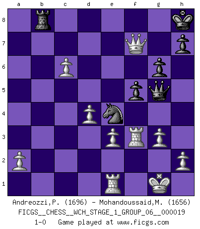Last move : 1-0 2018 June 7 13:25:13 [Event "FICGS__CHESS__WCH_STAGE_1_GROUP_06__000019"] [Site "FICGS"] [Date "2018.03.02"] [Round "1"] [White "Andreozzi,Paolo"] [Black "Mohandoussaid,Malik"] [Result "1-0"] [WhiteElo "1696"] [BlackElo "1656"] 1.d4 f5 2.Nf3 Nf6 3.g3 e6 4.Bg2 Be7 5.O-O O-O 6.c4 d5 7.Nc3 Nbd7 8.b3 c6 9.Ng5 Nb8 10.Bf4 Bd6 11.Bxd6 Qxd6 12.e3 Bd7 13.Nf3 Be8 14.c5 Qd8 15.b4 Nbd7 16.b5 Bh5 17.Qb3 Qe7 18.bxc6 bxc6 19.Qa4 Nb8 20.Ne5 Nfd7 21.Nxc6 Nxc6 22.Qxc6 Rac8 23.Qa6 Nf6 24.f3 e5 25.Rae1 e4 26.Nb5 exf3 27.Bxf3 Bxf3 28.Rxf3 Ne4 29.Qxa7 Qg5 30.Nd6 Ra8 31.Qb7 Rab8 32.Qxd5+ Kh8 33.Nf7+ Rxf7 34.Qxf7 g6 35.c6 1-0 This chess game has been lost on time (started : 2018.03.02 0:49:27) Dutch Kingside Castling by player White (move 5) Kingside Castling by player Black (move 5) Player White won this chess game. Follow this game move after move (download)The laws of Chess do not permit a free choice: you have to move whether you like it or not. (Emanuel Lasker) Die Fehler sind da, Sie warten nur darauf gemacht zu werden. (Savielly Grigorievitsch Tartakower) Yo he agregado estos principios a la ley: pongan los Caballos en acción antes de que los dos Alfiles sean desarrollados. (Emanuel Lasker) Les Echecs ne sont pas pour les âmes timides. Ils requièrent un homme entier, qui ne s'arrête pas aveuglément à ce qui a été déjà établi, mais qui tente individuellement de sonder les profondeurs du jeu. (W. Steinitz) I couldn't make any sense out of what this particular thread is about. It sounds like R2 D2 computer speaking. A space fight ?!? Some 'command' problems in Moscow ? Some killers & narcotic addicts attacking some game & a god wannabe ?? (Dinesh De Silva, lost in a russian conflict in FICGS forum)