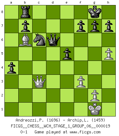 Last move : 0-1 2018 March 18 11:6:25 [Event "FICGS__CHESS__WCH_STAGE_1_GROUP_06__000019"] [Site "FICGS"] [Date "2018.03.02"] [Round "1"] [White "Andreozzi,Paolo"] [Black "Archip,Laurentiu"] [Result "0-1"] [WhiteElo "1696"] [BlackElo "1459"] 1.e4 c5 2.Nf3 Nc6 3.a3 d6 4.d4 cxd4 5.Nxd4 Nf6 6.f3 e5 7.Nb3 d5 8.Bb5 Be6 9.O-O Qb6+ 10.Rf2 Qxb5 11.Nc3 Qb6 12.exd5 Nxd5 13.Nxd5 Bxd5 14.Bg5 Bxb3 15.cxb3 Bc5 16.Bh4 O-O 17.Qd7 Qxb3 18.Raf1 Qxb2 19.Qg4 Bxf2+ 20.Bxf2 Qxa3 21.h4 Qb4 22.Qf5 Qf4 23.Qb1 Qb4 24.Qa2 a5 25.Rb1 Qe7 26.h5 Rfb8 27.Rb6 Qc7 28.Qc2 Ra6 29.Qb2 Rxb6 30.Bxb6 Qd6 31.Qc3 a4 0-1 Sicilian defense Kingside Castling by player White (move 9) Kingside Castling by player Black (move 16) Player Black won this chess game. Follow this game move after move (download)Chess is like war on a board. (Bobby Fischer) Es gibt nur zwei wahre Schachgenies - das andere war Wilhelm Steinitz, der Weltmeister von 1872 bis 1894. (Robert James Fischer) El Ajedrez es realmente noventa y nueve por ciento calculación. (Soltis) Horreur, mais aussi harmonie suprême : qu'y avait-il en effet au monde en dehors des échecs ? Le brouillard, l'inconnu, le non-être... (Vladimir Nabokov) The arrogant army will lose certainly the battle. (Chinese proverb)