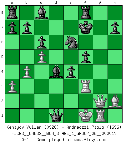 Last move : 0-1 2018 April 19 5:53:35 [Event "FICGS__CHESS__WCH_STAGE_1_GROUP_06__000019"] [Site "FICGS"] [Date "2018.03.02"] [Round "1"] [White "Kehayov,Yulian"] [Black "Andreozzi,Paolo"] [Result "0-1"] [WhiteElo "0928"] [BlackElo "1696"] 1.d4 f5 2.Nc3 d5 3.Bf4 Nf6 4.Nb5 Na6 5.e3 c6 6.Nc3 e6 7.Nf3 Be7 8.Be2 O-O 9.O-O Ng4 10.h3 Nf6 11.Ne5 Qe8 12.Na4 Nc7 13.c4 Bd8 14.c5 Ne4 15.f3 Ng5 16.h4 Nf7 17.Nxf7 Qxf7 18.b4 Bxh4 19.Bh2 Ne8 20.g3 Qg6 21.Rf2 Bf6 22.Rg2 e5 23.a3 Nc7 24.Nc3 e4 25.f4 Qh6 26.Kf2 g5 27.Qe1 gxf4 28.gxf4 Kf7 29.Qg1 Ne6 30.Rg3 Nxd4 31.Rd1 Ne6 32.Qg2 Bxc3 33.Rg1 d4 34.exd4 Qxf4+ 35.Rf3 Bxd4+ 36.Kf1 Qc1+ 37.Bd1 Qxd1+ 0-1 Dutch Kingside Castling by player Black (move 8) Kingside Castling by player White (move 9) Player Black won this chess game. Follow this game move after move (download)Chess makes man wiser and clear-sighted. (Vladimir Putin) Ich glaube, ich kenne inzwischen die Gründe für mein Versagen: schachliche Charakterfehler. Ich war nie ein Wunderkind und in meiner gesamten menschlichen Entwicklung immer zu langsam. (Viktor Kortschnoi) En el tablero, la mentira e hipocresía no sobreviven mucho. (Emanuel Lasker) Fischer est le meilleur joueur du monde et Karpov n'est qu'un joueur de bistrot. (Garry Kasparov, agé de 16 ans) Are you threatening me, Master Jedi ? (Chancellor Palpatine in Star Wars ep.3)
