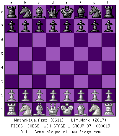 Last move : 0-1 2018 April 22 21:35:23 [Event "FICGS__CHESS__WCH_STAGE_1_GROUP_07__000019"] [Site "FICGS"] [Date "2018.03.23"] [Round "1"] [White "Mathakiya,Azaz"] [Black "Lim,Mark"] [Result "0-1"] [WhiteElo "0611"] [BlackElo "2017"] 0-1 This chess game has been lost on time (started : 2018.03.23 18:23:7) Player Black won this chess game. Follow this game move after move (download)I believe that Chess possesses a magic that is also a help in advanced age. A rheumatic knee is forgotten during a game of Chess and other events can seem quite unimportant in comparison with a catastrophe on the chessboard. (Vlastimil Hort) Ja, jede Frau in Holland liebt mich bestimmt, und alle Männer hassen mich. (Loek van Wely) El Ajedrez es el gimnasio de la mente. (Blaise Pascal) Les échecs sont plus proches de l'art de l'assassinat que de l'art de la guerre. (Arturo Perez-Reverte) Dave, my mind is going. I can feel it. (HAL 9000 in 2001, a space odyssey)