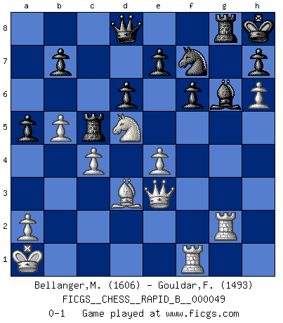 Last move : 0-1 2007 August 3 13:56:22 [Event "FICGS__CHESS__RAPID_B__000049"] [Site "FICGS"] [Date "2007.04.25"] [Round "1"] [White "Bellanger,Michel"] [Black "Gouldar,Frances"] [Result "0-1"] [WhiteElo "1606"] [BlackElo "1493"] 1.e4 c5 2.Nf3 d6 3.d4 cxd4 4.Nxd4 Nf6 5.Nc3 g6 6.Be3 Bg7 7.f3 O-O 8.Qd2 Nc6 9.O-O-O Nxd4 10.Bxd4 Be6 11.Kb1 Rc8 12.g4 Ne8 13.Bxg7 Nxg7 14.h4 Rc5 15.h5 g5 16.h6 Ne8 17.Nd5 f6 18.Bd3 Nc7 19.b4 Rc6 20.f4 gxf4 21.Qxf4 Kh8 22.c4 Bf7 23.g5 Ne6 24.Qe3 Nxg5 25.Rhf1 a5 26.b5 Rc5 27.Rd2 Rg8 28.Rg2 Bg6 29.Ka1 Nf7 0-1 This chess game has been lost on time (started : 2007.04.25 15:52:58) Sicilian : Dragon, Yugoslav attack, 7...O-O Kingside Castling by player Black (move 7) Queenside Castling by player White (move 9) Player Black won this chess game. Follow this game move after move (download)I guess a certain amount of temperament is expected of Chess geniuses. (Ron Gross) Schach verlangt totale Konzentration. (Robert James Fischer) En un gambito tu regalas un Peón por el bién de tomar un juego perdido. (Samuel Standige Boden) Le jeu d'échecs fait naître et fortifie en nous plusieurs qualités précieuses dans le cours de l'existence, telles que la prévoyance, la circonspection, la prudence, et la persévérance. (Benjamin Franklin - 1783, la morale des échecs) Better than a thousand days of diligent study is one day with a great teacher. (Japanese proverb)