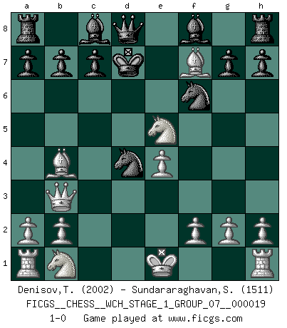 Last move : 1-0 2018 April 21 5:30:1 [Event "FICGS__CHESS__WCH_STAGE_1_GROUP_07__000019"] [Site "FICGS"] [Date "2018.03.02"] [Round "1"] [White "Denisov,Timofey"] [Black "Sundararaghavan,Shailesh"] [Result "1-0"] [WhiteElo "2002"] [BlackElo "1511"] 1.d4 d5 2.c4 dxc4 3.Nf3 Nc6 4.d5 Nb8 5.e4 e6 6.Bxc4 exd5 7.Bxd5 Nf6 8.Bxf7+ Ke7 9.Qb3 Nc6 10.Bd2 Nd4 11.Bb4+ Kd7 12.Ne5+ 1-0 QGA : 3.Nf3 Player White won this chess game. Follow this game move after move (download)All that matters on the Chessboard is good moves. (Bobby Fischer) Das Schach hält seine Meister in eigenen Banden, Fesseln; auf vielerlei Weise formt es ihren Geist, so dass die innere Freiheit selbst des Stärksten beeinflusst wird. (Albert Einstein) Muchos se han convertido en Maestros de Ajedrez, nadie se ha convertido en el Maestro del Ajedrez. (Siegbert Tarrasch) C'est une question de caractère, Beaucoup de gens perdent leur motivation très vite. D'autres, ils sont rares, peuvent la conserver très longtemps. J'aime les échecs, encore aujourd'hui je suis heureux d'analyser des parties. J'aime toujours gagner, je déteste encore perdre. Bien jouer est important pour mon intégrité intellectuelle et morale. Et puis les échecs vivent en ce moment une période historique grâce à Internet. Ils se développent dans les systèmes éducatifs à travers le monde. Ils sortent de leur ghetto, et c'est mon rôle de mener à bien cette révolution. (Gary Kasparov) True nature is revealed in times of difficulty. (Chinese proverb)
