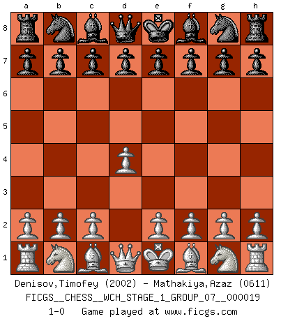 Last move : 1-0 2018 May 22 23:48:54 [Event "FICGS__CHESS__WCH_STAGE_1_GROUP_07__000019"] [Site "FICGS"] [Date "2018.03.23"] [Round "1"] [White "Denisov,Timofey"] [Black "Mathakiya,Azaz"] [Result "1-0"] [WhiteElo "2002"] [BlackElo "0611"] 1.d4 1-0 This chess game has been lost on time (started : 2018.03.23 18:23:7) Queen's pawn Player White won this chess game. Follow this game move after move (download)War is the child of passion, passion is the child of narcissism and narcissism is the child. (...) Another game ? (Thibault de Vassal) Ich erzeugte keinen Neid, da mich die Schachspieler als Musiker und die Musiker als Schachspieler betrachteten. (Mark Taimanov) Nunca antes ha habido un jugador de Ajedrez con tal conocimiento a fondo de las complejidades del juego y una inmensa voluntad absolutamente indomable de ganar. Yo pienso que Fischer es el jugador mas grande que jamás haya existido. (Lisa Lane) J'apprécie les joueurs d'est-indienne, c'est grâce à eux que je nourris ma famille depuis tant d'années. (Petrosian) If you don't practice you don't deserve to win. (Andre Agassi)