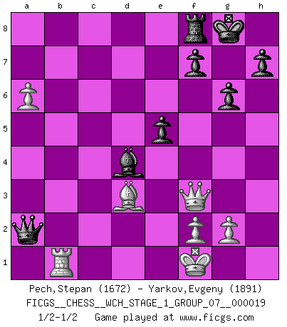 Last move : 1/2-1/2 2018 July 11 12:52:31 [Event "FICGS__CHESS__WCH_STAGE_1_GROUP_07__000019"] [Site "FICGS"] [Date "2018.03.02"] [Round "1"] [White "Pech,Stepan"] [Black "Yarkov,Evgeny"] [Result "1/2-1/2"] [WhiteElo "1672"] [BlackElo "1891"] 1.d4 d5 2.c4 c6 3.Nf3 Nf6 4.Nc3 e6 5.e3 Nbd7 6.Bd3 dxc4 7.Bxc4 b5 8.Bd3 Bb7 9.e4 b4 10.Na4 c5 11.e5 Nd5 12.O-O cxd4 13.Re1 g6 14.Bg5 Qa5 15.Nxd4 a6 16.a3 bxa3 17.bxa3 Bg7 18.Rb1 Rb8 19.Bd2 Qd8 20.Rxb7 Rxb7 21.Bxa6 Rc7 22.Ba5 Qb8 23.Bxc7 Qxc7 24.Nb5 Qb8 25.Nac3 Nxc3 26.Nxc3 Bxe5 27.Ne4 Bxh2+ 28.Kf1 Be5 29.a4 Nf6 30.Nxf6+ Bxf6 31.Qf3 Qb2 32.Bd3 O-O 33.a5 Bd4 34.Rb1 Qa2 35.a6 e5 1/2-1/2 QGD Slav : 4.Nc3 Kingside Castling by player White (move 12) Kingside Castling by player Black (move 32) This chess game ended in a draw. Follow this game move after move (download)I'm not afraid of Spassky. The world knows I'm the best. You don't need a match to prove it. (Bobby Fischer) Das Schachspiel ist ein See, in welchem eine Mücke baden und ein Elefant ertrinken kann. (Emanuel Lasker) El juego del Ajedrez no es solamente una diversión quieta; algunas cualidades muy valuables de la mente se pueden adquirir y cultivar con el, como convertirlos en habitos disponibles para toda ocasión; ya que la vida es algo así como el Ajedrez. (Benjamin Franklin) Il n'y a pas de prix trop élevé au scalp de l'ennemi. (Koblentz) All art requires courage. (Anne Tucker)
