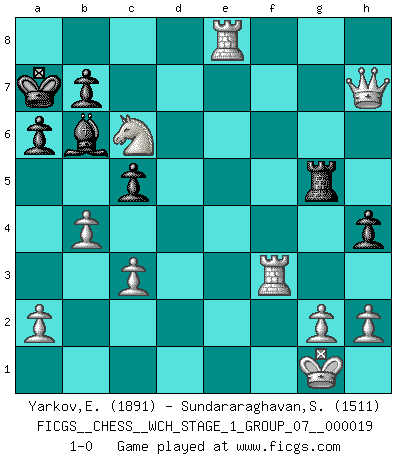 Last move : 1-0 2018 April 29 5:6:17 [Event "FICGS__CHESS__WCH_STAGE_1_GROUP_07__000019"] [Site "FICGS"] [Date "2018.03.02"] [Round "1"] [White "Yarkov,Evgeny"] [Black "Sundararaghavan,Shailesh"] [Result "1-0"] [WhiteElo "1891"] [BlackElo "1511"] 1.e4 e5 2.Nf3 Nc6 3.d4 exd4 4.Nxd4 Bc5 5.Nb3 Bb4+ 6.c3 Be7 7.f4 d6 8.N1d2 Nf6 9.Bd3 Bd7 10.Nf3 h6 11.Qc2 Bg4 12.O-O Bxf3 13.Rxf3 Qd7 14.Rg3 g6 15.Bc4 h5 16.Rf3 O-O-O 17.Bxf7 Kb8 18.Bd2 Rdf8 19.Bxg6 h4 20.Bf5 Qe8 21.Re1 Rfg8 22.Be6 Rg7 23.Nd4 Nd8 24.Bh3 Rhg8 25.Nf5 Rh7 26.e5 dxe5 27.fxe5 Bc5+ 28.Nd4 Ng4 29.Qxh7 Ne6 30.Re4 Ng5 31.Bxg5 Rxg5 32.Bxg4 a6 33.b4 Bb6 34.Bd7 Qd8 35.e6 c5 36.e7 Qxd7 37.e8Q+ Qxe8 38.Rxe8+ Ka7 39.Nc6+ 1-0 Scotch : Romanishin variation Kingside Castling by player White (move 12) Queenside Castling by player Black (move 16) Promotion Queen by player White (move 37) Player White won this chess game. Follow this game move after move (download)You need not play well - just help your opponent to play badly. (Genrikh Chepukaitis) Offensichtlich kennt Kasparow nichts anderes als Schach, und ich könnte 500 weitere Spieler dieser Sorte benennen. (Judith Polgar) Fischer deseaba darle a los Rusos una sopa de su propia medicina. (Larry Evans) Les Echecs représentent une sphère d'idées créatrices basée sur la volonté des deux protagonistes. (Smyslov) History is a gallery of pictures in which there are few originals and many copies. (Alexis de Tocqueville)