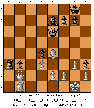 Last move : 1/2-1/2 2018 July 11 8:27:45 [Event "FICGS__CHESS__WCH_STAGE_1_GROUP_07__000019"] [Site "FICGS"] [Date "2018.03.02"] [Round "1"] [White "Pech,Jaroslav"] [Black "Yarkov,Evgeny"] [Result "1/2-1/2"] [WhiteElo "1482"] [BlackElo "1891"] 1.c4 Nf6 2.Nc3 e5 3.Nf3 Nc6 4.g3 d5 5.cxd5 Nxd5 6.Bg2 Nb6 7.O-O Be7 8.d3 O-O 9.a3 Be6 10.b4 a5 11.b5 Nd4 12.Nd2 c6 13.bxc6 Nxc6 14.Rb1 a4 15.Nf3 Bb3 16.Qd2 Nd5 17.Nxd5 Qxd5 18.Qb2 Qe6 19.Be3 Ra5 20.Nd2 Rb5 21.Rfc1 h5 22.Nxb3 Rxb3 23.Qa2 Nd4 24.Bxd4 exd4 25.Rxb3 axb3 26.Qb2 Ra8 27.Rb1 Rxa3 28.Bxb7 h4 29.Be4 h3 1/2-1/2 English Opening Kingside Castling by player White (move 7) Kingside Castling by player Black (move 8) This chess game ended in a draw. Follow this game move after move (download)The winner of the game is the player who makes the next-to-last mistake. (Savielly Tartakover) Verschiedene, sehr schätzbare und im Laufe des Lebens nützliche Eigenschaften des Geistes können durch das Schachspiel erworben und gekräftigt werden, so dass sie zu Gewohnheiten werden, die uns nie im Stich lassen. (Benjamin Franklin) Cuando le juegas a Fischer, no es una cuestion de si vas a ganar o perder. Es una cuestion de si vas a sobrevivir. (Boris Spassky) Toutes choses étant égales, c'est la conviction qui gagne. Alliée à une volonté de vaincre, elle sert de détonateur, suscite des idées, disperse les doutes et aide à penser clairement. (Robert Fischer) Logic : The art of thinking and reasoning in strict accordance with the limitations and incapacities of the human misunderstanding. (Ambrose Bierce)