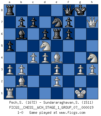Last move : 1-0 2018 May 25 22:2:23 [Event "FICGS__CHESS__WCH_STAGE_1_GROUP_07__000019"] [Site "FICGS"] [Date "2018.03.02"] [Round "1"] [White "Pech,Stepan"] [Black "Sundararaghavan,Shailesh"] [Result "1-0"] [WhiteElo "1672"] [BlackElo "1511"] 1.c4 e5 2.Nc3 Nf6 3.Nf3 Nc6 4.g3 Bc5 5.Bg2 e4 6.Nh4 e3 7.fxe3 O-O 8.a3 a5 9.O-O d6 10.d4 Bb6 11.b3 Bg4 12.Qd3 Qd7 13.Rxf6 gxf6 14.Bb2 Rfe8 15.Nd5 Re6 16.h3 Bh5 17.Qf5 Qe8 18.Qxh5 Qf8 19.Be4 Ne7 20.Qxh7+ 1-0 English Opening Kingside Castling by player Black (move 7) Kingside Castling by player White (move 9) Player White won this chess game. Follow this game move after move (download)The defensive power of a pinned piece is only imaginary. (Aaron Nimzovich) Garry Kasparov war erst in der Großmeister-Organisation GMA, dann in der Profischach-Vereinigung PCA, zum Schluss kehrte er wieder in den Schoß der FIDE zurück. Aber gut, manche Leute sind flexibel (Viswanathan Anand) Ciertamente, de todas la drogas del mundo, el Ajedrez debe ser el mas placentero permamentemente. (Assiac) Je ne suis pas le dernier à jouer lâchement des coups douteux pendant le zeïtnot de l'adversaire pour l'achever: en effet les coups qui font le plus peur sont ceux que l'on ne comprend pas. Je me fais souvent peur quand je joue. (Un professeur anonyme) Life is like a game of cards: the hand you are dealt represents determinism; the way you play it is free will. (Jawaharlal Nehru)
