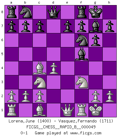 Last move : 0-1 2007 June 10 6:57:10 [Event "FICGS__CHESS__RAPID_B__000049"] [Site "FICGS"] [Date "2007.04.25"] [Round "1"] [White "Lorena,June"] [Black "Vasquez,Fernando"] [Result "0-1"] [WhiteElo "1400"] [BlackElo "1711"] 1.d4 d5 2.e4 dxe4 3.Nc3 Nf6 4.f3 exf3 5.Nxf3 g6 6.Bc4 Bg7 7.O-O O-O 8.Qe1 Bf5 0-1 This chess game has been lost on time (started : 2007.04.25 15:52:58) Blackmar gambit Kingside Castling by player White (move 7) Kingside Castling by player Black (move 7) Player Black won this chess game. Follow this game move after move (download)Bobby is the finest Chess player this country ever produced. His memory for the moves, his brilliance in dreaming up combinations, and his fierce determination to win are uncanny. (John Collins) Der Traum, für den ich lebe, ist der von einem freien Russland. Viele mögen sagen: Russland hat doch ein Parlament, einen gewählten Präsidenten. Aber ich spüre, dass in meiner Heimat die Angst wiederkehrt. Eine Angst, sich frei zu äußern, bestimmte Dinge zu tun (Garry Kasparov) Con el fin de mejorar tu juego, debes de estudiar los finales antes que todo, ya que mientras que los finales pueden ser estudiados y dominados por sí mismos, el juegomedio y la apertura deben de ser estudiados en relación con los finales. (José Raúl Capablanca) Les Echecs mettent en conflit, non pas deux intelligences, mais deux volontés. (Lasker) If we knew what we were doing, we would not call it research. (Albert Einstein)