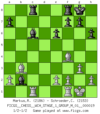 Last move : 1/2-1/2 2018 April 1 21:32:31 [Event "FICGS__CHESS__WCH_STAGE_1_GROUP_M_01__000019"] [Site "FICGS"] [Date "2018.03.02"] [Round "1"] [White "Markus,Roland"] [Black "Schroeder,Christoph"] [Result "1/2-1/2"] [WhiteElo "2186"] [BlackElo "2153"] 1.Nf3 d5 2.g3 c5 3.Bg2 Nc6 4.d4 e6 5.O-O Nf6 6.c4 dxc4 7.Qa4 Bd7 8.Qxc4 cxd4 9.Nxd4 Rc8 10.Nc3 Nxd4 11.Qxd4 Bc5 12.Qh4 h6 13.Bxb7 Rb8 14.Ne4 Be7 15.Nxf6+ Bxf6 16.Qe4 Qb6 17.Bd5 O-O 18.Bb3 Qc6 19.Qxc6 Bxc6 20.Bf4 Rbc8 21.Rac1 Bxb2 1/2-1/2 Reti : King's Indian attack Kingside Castling by player White (move 5) Kingside Castling by player Black (move 17) This chess game ended in a draw. Follow this game move after move (download)Discovered check is the dive bomber of the Chessboard. (Reuben Fine) Ich erzeugte keinen Neid, da mich die Schachspieler als Musiker und die Musiker als Schachspieler betrachteten. (Mark Taimanov) Aquel que toma al Peón de Caballo de la Reina, se pasará la noche a dormir en la calle. (Anónimo) On n'a jamais que l'âge auquel on a commence à jouer aux échecs car après on cesse de vieillir. (Capablanca) I find television to be very educating. Every time somebody turns on the set, I go in the other room and read a book. (Groucho Marx)