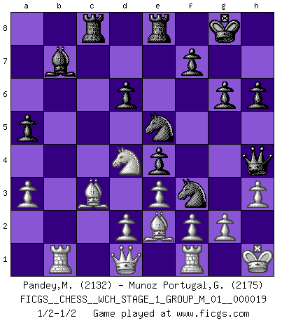 Last move : 1/2-1/2 2018 June 17 7:48:7 [Event "FICGS__CHESS__WCH_STAGE_1_GROUP_M_01__000019"] [Site "FICGS"] [Date "2018.03.02"] [Round "1"] [White "Pandey,Manoj"] [Black "Munoz Portugal,Guillermo"] [Result "1/2-1/2"] [WhiteElo "2132"] [BlackElo "2175"] 1.c4 e5 2.Nc3 Nf6 3.Nf3 Nc6 4.e3 Bb4 5.Qc2 O-O 6.Nd5 Be7 7.a3 Re8 8.Bd3 h6 9.O-O d6 10.b4 Nb8 11.Bb2 a5 12.h3 Nbd7 13.Nxe7+ Qxe7 14.Be2 b6 15.Nh4 g6 16.Nf3 e4 17.Nd4 Bb7 18.Nb5 Ne5 19.c5 Ra8c8 20.cxd6 cxd6 21.Qd1 Nf6d7 22.Bc3 Nf3 23.Kh1 Nd7e5 24.bxa5 bxa5 25.Nd4 Qh4 26.Rb1 1/2-1/2 English Opening Kingside Castling by player Black (move 5) Kingside Castling by player White (move 9) This chess game ended in a draw. Follow this game move after move (download)You sit at the board and suddenly your heart leaps. Your hand trembles to pick up the piece and move it. But what Chess teaches you is that you must sit there calmly and think about whether it's really a good idea and whether there are other better ideas. (Stanley Kubrick) Schach ist Krieg, im Schach geht es um testosterongesteuerte Urschreie. (Garry Kasparov) Es el objetivo de la escuela moderna no tratar cada posición de acuerdo a una regla general, sino de acuerdo al principio inherente en la posición. (Richard Reti) Plusieurs personnes se sont demandées comment Tal faisait pour gagner... En fait, c'est très simple ! Il met ses pièces au centre de l'échiquier et les sacrifie quelque part ! (David Bronstein) Memory is a way of holding onto the things you love, the things you are, the things you never want to lose. (from the television show: The Wonder Years)