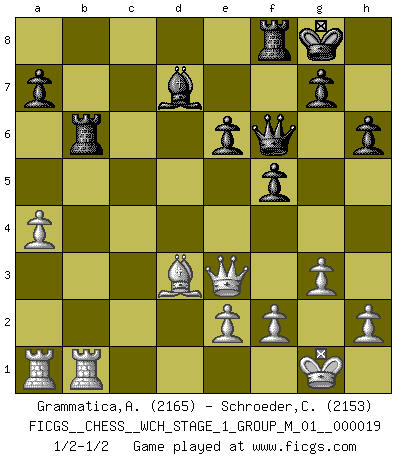 Last move : 1/2-1/2 2018 April 3 20:1:58 [Event "FICGS__CHESS__WCH_STAGE_1_GROUP_M_01__000019"] [Site "FICGS"] [Date "2018.03.02"] [Round "1"] [White "Grammatica,Andrea"] [Black "Schroeder,Christoph"] [Result "1/2-1/2"] [WhiteElo "2165"] [BlackElo "2153"] 1.d4 d5 2.c4 e6 3.Nf3 Nf6 4.g3 dxc4 5.Bg2 c5 6.O-O Nc6 7.Qa4 Bd7 8.Qxc4 cxd4 9.Nxd4 Rc8 10.Nc3 Nxd4 11.Qxd4 Bc5 12.Qh4 h6 13.Bxb7 Rb8 14.Ne4 Be7 15.Ba6 O-O 16.Nxf6+ Bxf6 17.Qe4 Bxb2 18.Bxb2 Rxb2 19.Rfb1 Rb6 20.Bd3 f5 21.Qe3 Qf6 22.a4 1/2-1/2 Queen's gambit declined Kingside Castling by player White (move 6) Kingside Castling by player Black (move 15) This chess game ended in a draw. Follow this game move after move (download)A Chess game is a dialogue, a conversation between a player and his opponent. Each move by the opponent may contain threats or be a blunder, but a player cannot defend against threats or take advantage of blunders if he does not first ask himself: What is my opponent planning after each move ? (Bruce A. Moon) Karpov ist ein Museumsstück. (Garry Kasparov) Las piezas de Ajedrez son los bloques del alfabeto que moldean los pensamientos; y esos pensamientos, aunque hagan un diseño visual en el tablero, expresan abstractamente su belleza como un poema. (Marcel Duchamp) Les échecs sont un jeu terrible. Si vous n'avez pas le centre, votre adversaire a une position plus libre. Par contre, si vous avez le centre, alors vous avez vraiment quelque chose pour laquelle vous inquiéter ! (Siegbert Tarrasch) Without enthusiasm, virtue functions not at all, and vice only poorly. (Mignon McLaughlin, The Neurotic's Notebook, 1960)