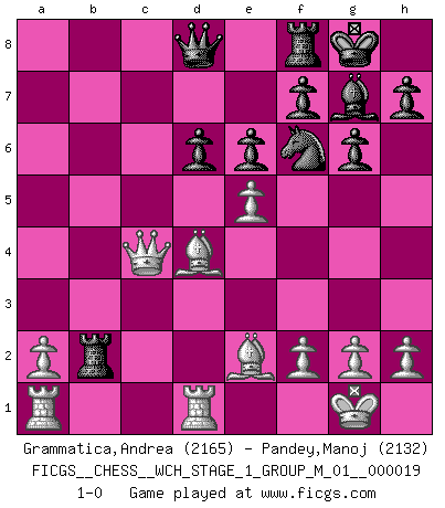 Last move : 1-0 2018 May 16 17:58:56 [Event "FICGS__CHESS__WCH_STAGE_1_GROUP_M_01__000019"] [Site "FICGS"] [Date "2018.03.02"] [Round "1"] [White "Grammatica,Andrea"] [Black "Pandey,Manoj"] [Result "1-0"] [WhiteElo "2165"] [BlackElo "2132"] 1.d4 g6 2.c4 c5 3.Nf3 cxd4 4.Nxd4 Nc6 5.e4 Nf6 6.Nc3 d6 7.Be2 Nxd4 8.Qxd4 Bg7 9.Be3 O-O 10.Qd3 Bd7 11.O-O a6 12.Rfd1 b5 13.cxb5 axb5 14.Nxb5 Bxb5 15.Qxb5 Rb8 16.Qc4 Rxb2 17.e5 e6 18.Bd4 1-0 Comment by player 2 : Manoj Pandey : horrible misclick - I intended (on 17...) d5 and definitely not e6?? - can't see no resign button so Grammatrica please make your best move because when it is my move I'll have the 'resign' option. Alternatively, pl communicate this to M. Thibault [I cant because I havent joined the discussion-forum yet] to take this comment as my resignation and the adjudicate 1-0. Thank you. Modern defense Kingside Castling by player Black (move 9) Kingside Castling by player White (move 11) Player White won this chess game. Follow this game move after move (download)Blessed be the memory of him who gave the world this immortal game. (A. G. Gardiner) Smyslow ist ein Beweis dafür, dass ich noch zehn Jahre spielen kann! [der 75 jährige über den 85 jährigen] (Viktor Kortschnoi) Fischer deseaba darle a los Rusos una sopa de su propia medicina. (Larry Evans) Mon pion favori sur ma case favorite ! Bronstein en parlant d'un coup de pion en h5 quand il avait les Noirs. You can think I'm wrong, but that's no reason to quit thinking. (Gregory House, House M.D.)