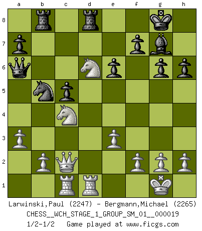 Last move : 1/2-1/2 2018 April 4 16:9:37 [Event "FICGS__CHESS__WCH_STAGE_1_GROUP_SM_01__000019"] [Site "FICGS"] [Date "2018.03.02"] [Round "1"] [White "Larwinski,Paul"] [Black "Bergmann,Michael"] [Result "1/2-1/2"] [WhiteElo "2247"] [BlackElo "2265"] 1.d4 d5 2.c4 e6 3.Nf3 Nf6 4.Nc3 c6 5.Bg5 h6 6.Bxf6 Qxf6 7.e3 g6 8.Bd3 Bg7 9.O-O O-O 10.Ne5 dxc4 11.Nxc4 Qe7 12.Qb3 b6 13.Be4 Bb7 14.Rfd1 Na6 15.a3 Rfd8 16.Bf3 Rab8 17.Rac1 c5 18.Bxb7 Qxb7 19.Nb5 Nc7 20.Nbd6 Qa6 21.dxc5 bxc5 22.Qc2 Nb5 1/2-1/2 Queen's gambit declined Kingside Castling by player White (move 9) Kingside Castling by player Black (move 9) This chess game ended in a draw. Follow this game move after move (download)It began to feel as though you were playing against Chess itself. - On playing against Robert Fischer. (Walter Shipman) Nach Morphy wurde nichts neues mehr in der Behandlung offener Positionen gefunden. (Mikhail Moiseyevich Botvinik) Cuando tu casa esta en llamas, no puedes ser molestado por tus vecinos. O, como decinos en Ajedrez, si tu Rey esta bajo ataque, no te preocupa perder un Peón del lado de la Reina. (Gary Kasparov) Des idées, des idées, j'en ai cent, j'en ai mille. Des bonnes, des mauvaises, applicables, irréalisables... Il suffit de faire le tri ! (Roos) Whatever you do, don't be bored. This is absolutely the most exciting time we could have possibly hoped to be alive. And things are just starting. (From movie Waking life)