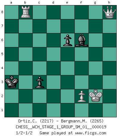 Last move : 1/2-1/2 2018 May 10 15:5:22 [Event "FICGS__CHESS__WCH_STAGE_1_GROUP_SM_01__000019"] [Site "FICGS"] [Date "2018.03.02"] [Round "1"] [White "Ortiz,Clodomiro"] [Black "Bergmann,Michael"] [Result "1/2-1/2"] [WhiteElo "2217"] [BlackElo "2265"] 1.e4 c5 2.Nf3 d6 3.d4 cxd4 4.Nxd4 Nf6 5.Nc3 a6 6.Be3 e6 7.Qf3 Nbd7 8.Be2 Qc7 9.g4 h6 10.h4 b5 11.a3 d5 12.g5 Nxe4 13.Nxe6 fxe6 14.Nxe4 Qxc2 15.Qh5+ Kd8 16.Ng3 Ne5 17.gxh6 Qxb2 18.O-O Rxh6 19.Bg5+ Be7 20.Bxh6 gxh6 21.Qxh6 Nc4 22.a4 Qf6 23.Qh7 Rb8 24.axb5 axb5 25.h5 Bb7 26.Bxc4 dxc4 27.Ne4 Bxe4 28.Qxe4 Qg5+ 29.Qg2 Kc7 30.h6 b4 31.h7 Qxg2+ 32.Kxg2 Bf6 33.Ra7+ Kb6 34.Rf7 Bh8 35.Rf4 Kb5 36.Rc1 c3 37.Rxb4+ Kxb4 38.Rb1+ Ka3 39.Rxb8 Bf6 40.h8Q 1/2-1/2 Sicilian : Najdorf, Byrne (English) attack Kingside Castling by player White (move 18) 10 pieces endgame at move 37 : White KRRPP , Black KRBPP WHITE : King + 2 Rooks 2 Pawns BLACK : King + 1 Rook 1 Bishop 2 Pawns 9 pieces endgame at move 37 : White KRPP , Black KRBPP WHITE : King + 1 Rook 2 Pawns BLACK : King + 1 Rook 1 Bishop 2 Pawns 8 pieces endgame at move 39 : White KRPP , Black KBPP WHITE : King + 1 Rook 2 Pawns BLACK : King + 1 Bishop 2 Pawns Promotion Queen by player White (move 40) This chess game ended in a draw. Follow this game move after move (download)An attack on the wing should be met by play in the center. (Nimzovitch) Ivan Sokolov treibt mich als Beifahrer an mit go Loeky go - . (Loek van Wely) Un entendimiento minucioso de las típicas continuaciones de mate hacen de las mas complicadas combinaciones de sacrificio que conducen hacia ellas no solo no dificiles, sino casi un asunto de rutina. (Siegbert Tarrasch) C'est la seule position que je connaisse où les deux camps sont mals. Propos prêtés à V. Anand. History is the quarrels of popes and kings, with wars or pestilences in every page; the men all so good for nothing, and hardly any women at all. (Jane Austen)