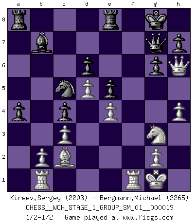 Last move : 1/2-1/2 2018 April 14 11:36:15 [Event "FICGS__CHESS__WCH_STAGE_1_GROUP_SM_01__000019"] [Site "FICGS"] [Date "2018.03.02"] [Round "1"] [White "Kireev,Sergey"] [Black "Bergmann,Michael"] [Result "1/2-1/2"] [WhiteElo "2203"] [BlackElo "2265"] 1.e4 e5 2.Nf3 Nc6 3.Bb5 a6 4.Ba4 Nf6 5.O-O Be7 6.Re1 b5 7.Bb3 d6 8.c3 O-O 9.h3 Nb8 10.d4 Nbd7 11.Nbd2 Bb7 12.Bc2 Re8 13.Nf1 Bf8 14.Ng3 g6 15.a4 c5 16.d5 c4 17.Bg5 Be7 18.Be3 Qc7 19.Qd2 Nc5 20.Bh6 Kh8 21.Bg5 Ng8 22.Be3 Nf6 23.Bg5 Ng8 24.Be3 Nf6 25.Ng5 Kg8 26.f4 exf4 27.Bxf4 Bf8 28.Nf3 Nfd7 29.Bh6 bxa4 30.Bxa4 f6 31.Bc2 a5 32.Rf1 a4 33.Rab1 Bxh6 34.Qxh6 Ne5 35.Nxe5 fxe5 36.h4 Qg7 1/2-1/2 Ruy Lopez : Closed Kingside Castling by player White (move 5) Kingside Castling by player Black (move 8) This chess game ended in a draw. Follow this game move after move (download)Botvinnik tried to take the mystery out of Chess, always relating it to situations in ordinary life. He used to call Chess a typical inexact problem similar to those which people are always having to solve in everyday life. (Garry Kasparov) Über Karpov: Er war und ist ein Vertreter der russischen Reaktionäre. Das steckt tief in seiner Seele, wehalb ich nicht nett mit ihm umgehen kann. (Viktor Kortschnoi) ¿Se han dado cuenta de que Fischer casi nunca ha tenido piezas malas? El las intercambia y las piezas malas se quedan con sus oponenets. (Yuri Balashov) Pour moi, les échecs ne sont pas un jeu mais un art. (Alexandre Alekhine) Difficult things take a long time, impossible things a little longer. (Author unknown)