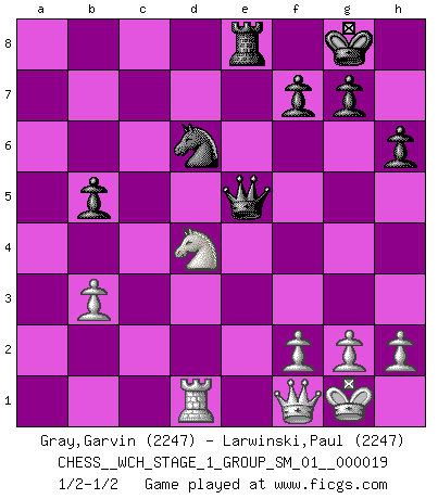 Last move : 1/2-1/2 2018 April 23 2:27:54 [Event "FICGS__CHESS__WCH_STAGE_1_GROUP_SM_01__000019"] [Site "FICGS"] [Date "2018.03.02"] [Round "1"] [White "Gray,Garvin"] [Black "Larwinski,Paul"] [Result "1/2-1/2"] [WhiteElo "2247"] [BlackElo "2247"] 1.e4 e5 2.Nf3 Nc6 3.Bb5 a6 4.Ba4 Nf6 5.O-O b5 6.Bb3 Bb7 7.d3 Be7 8.Re1 d6 9.c3 O-O 10.a4 Na5 11.Bc2 c5 12.Nbd2 Re8 13.Nf1 h6 14.d4 exd4 15.cxd4 d5 16.e5 Ne4 17.Ng3 cxd4 18.Nxe4 dxe4 19.Bxe4 Bxe4 20.Rxe4 Qd5 21.Rxd4 Qe6 22.Rd3 Rad8 23.Be3 Nc4 24.axb5 axb5 25.Bd4 Qf5 26.Qf1 Bc5 27.Rad1 Bxd4 28.Rxd4 Rxd4 29.Nxd4 Qxe5 30.b3 Nd6 1/2-1/2 Ruy Lopez : Archangelsk (counterthrust) variation Kingside Castling by player White (move 5) Kingside Castling by player Black (move 9) This chess game ended in a draw. Follow this game move after move (download)Modern Chess is too much concerned with things like Pawn structure. Forget it, Checkmate ends the game. (Nigel Short) Ein unbeabsichtigtes Patt ist der Gipfel der Dummheit. (Anonymous) Botvinnik trataba de restarle el misterio al Ajedrez, siempre relacionandolo a situaciones de la vida ordinaria. El gustaba de llamar al Ajedrez un típico problema inexacto similar a aquellos de los cuales la gente siempre tiene que enfrentarse en la vida cotidiana. (Garry Kasparov) Le génie consiste à savoir transgresser les règles au moment opportun. (Teichmann) The next best thing to gambling and winning is gambling and loosing. (Nick Dandalos)