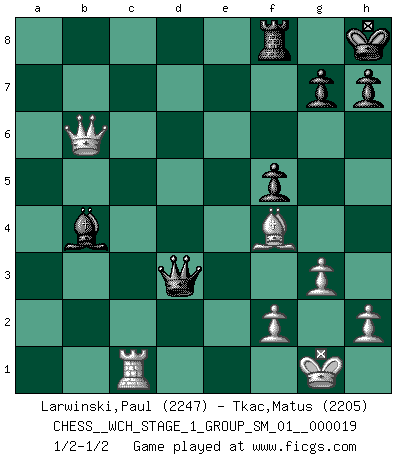 Last move : 1/2-1/2 2018 April 2 19:44:14 [Event "FICGS__CHESS__WCH_STAGE_1_GROUP_SM_01__000019"] [Site "FICGS"] [Date "2018.03.02"] [Round "1"] [White "Larwinski,Paul"] [Black "Tkac,Matus"] [Result "1/2-1/2"] [WhiteElo "2247"] [BlackElo "2205"] 1.Nf3 Nf6 2.c4 e6 3.d4 b6 4.g3 Bb7 5.Bg2 Be7 6.O-O O-O 7.Nc3 Ne4 8.Qc2 Nxc3 9.Qxc3 a5 10.Rd1 d6 11.Qc2 f5 12.d5 e5 13.c5 Kh8 14.cxb6 cxb6 15.Nxe5 dxe5 16.d6 Nc6 17.Qa4 Nd4 18.Rxd4 exd4 19.Bxb7 Qxd6 20.Bxa8 Rxa8 21.Bf4 Qd5 22.Rc1 Bc5 23.a3 d3 24.exd3 Qxd3 25.Qc6 Rf8 26.b4 axb4 27.axb4 Bxb4 28.Qxb6 1/2-1/2 Reti Opening Kingside Castling by player White (move 6) Kingside Castling by player Black (move 6) This chess game ended in a draw. Follow this game move after move (download)Even the laziest King flees wildly in the face of a double check ! (Aaron Nimzowitsch) Dein Körper muss in Topform sein. Dein Schach verfällt, wenn dein Körper verfällt. Der Körper kann nicht vom Geist getrennt werden. (Robert James Fischer) Botvinnik trató de alejar el misterio referente al Ajedrez, siempre relacionandolo a situaciones de la vida diaria. Solía llamar al Ajedrez un problema inexacto típico, similar a aquellos en que la gente tiene siempre que resolver a cada día. (Garry Kasparov) Plusieurs personnes se sont demandées comment Tal faisait pour gagner... En fait, c'est très simple ! Il met ses pièces au centre de l'échiquier et les sacrifie quelque part ! (David Bronstein) Work expands to fill the time available. (C. Northcote Parkinson, in Parkinson's Laws)