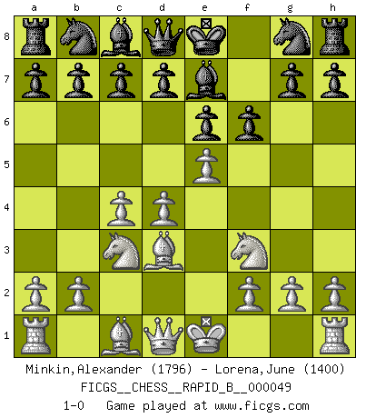 Last move : 1-0 2007 June 22 8:21:26 [Event "FICGS__CHESS__RAPID_B__000049"] [Site "FICGS"] [Date "2007.04.25"] [Round "1"] [White "Minkin,Alexander"] [Black "Lorena,June"] [Result "1-0"] [WhiteElo "1796"] [BlackElo "1400"] 1.c4 Nf6 2.Nc3 e6 3.e4 Bc5 4.e5 Ng8 5.d4 Be7 6.Nf3 f6 7.Bd3 1-0 This chess game has been lost on time (started : 2007.04.25 15:52:58) English : Mikenas-Carls variation Player White won this chess game. Follow this game move after move (download)Blessed be the memory of him who gave the world this immortal game. (A. G. Gardiner) Ich hatte meine größten Erfolge, als ich 47 Jahre alt war. Kasparow war noch nicht mal 42 und hat das Schach schon im Stich gelassen. (Viktor Kortschnoi) No existe un remordimiento como el remordimiento del Ajedrez. (H. G. Wells) Nous vivons dans un monde échiquéen : chaque jour qui passe est un défi à relever. (Philosophe Sasha) All art requires courage. (Anne Tucker)