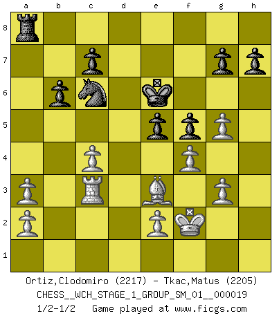 Last move : 1/2-1/2 2018 April 6 8:35:19 [Event "FICGS__CHESS__WCH_STAGE_1_GROUP_SM_01__000019"] [Site "FICGS"] [Date "2018.03.02"] [Round "1"] [White "Ortiz,Clodomiro"] [Black "Tkac,Matus"] [Result "1/2-1/2"] [WhiteElo "2217"] [BlackElo "2205"] 1.Nf3 Nf6 2.d4 e6 3.c4 b6 4.g3 Bb7 5.Bg2 Be7 6.Nc3 Ne4 7.Qd3 Nxc3 8.Qxc3 O-O 9.O-O a5 10.h4 d6 11.Qd3 f5 12.Ng5 Bxg2 13.Kxg2 Bxg5 14.hxg5 Nc6 15.Rd1 e5 16.dxe5 dxe5 17.Qd5+ Qxd5+ 18.Rxd5 Rfd8 19.Be3 Kf7 20.Rc1 a4 21.f4 a3 22.Rxd8 Rxd8 23.bxa3 Ra8 24.Rc3 Ke6 25.Kf2 1/2-1/2 Reti Opening Kingside Castling by player Black (move 8) Kingside Castling by player White (move 9) This chess game ended in a draw. Follow this game move after move (download)Bobby is the most misunderstood, misquoted celebrity walking the face of this earth. (Yasser Seirawan) Wenn es im Universum noch irgendwo intelligente Lebewesen gibt, dann kennen sie Go. (Emanuel Lasker) Bobby Fischer es el mas grande genio de Ajedrez de todos los tiempos. (Alexander Kotov) Une platitude souvent récitée à propos des Echecs est qu'une des choses les plus difficiles à réaliser est de gagner une position gagnante. Cela ne manque pas de sens mais, pour ma part, j'ai toujours trouvé plus difficile de gagner une position perdante. (Tim Krabbe) For a mechanic, you seem to do an excessive amount of thinking. (C-3PO in Star Wars ep.2)