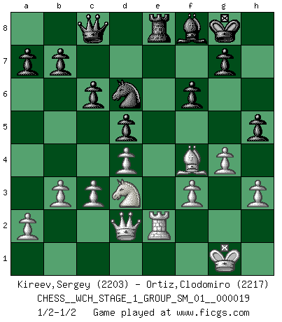 Last move : 1/2-1/2 2018 March 12 11:50:59 [Event "FICGS__CHESS__WCH_STAGE_1_GROUP_SM_01__000019"] [Site "FICGS"] [Date "2018.03.02"] [Round "1"] [White "Kireev,Sergey"] [Black "Ortiz,Clodomiro"] [Result "1/2-1/2"] [WhiteElo "2203"] [BlackElo "2217"] 1.e4 e5 2.Nf3 Nc6 3.Bb5 Nf6 4.O-O Nxe4 5.Re1 Nd6 6.Nxe5 Be7 7.Bf1 Nxe5 8.Rxe5 O-O 9.d4 Bf6 10.Re1 Re8 11.c3 Rxe1 12.Qxe1 Ne8 13.Bf4 d5 14.Nd2 Nd6 15.Qe3 Be6 16.Bd3 Qd7 17.Nf3 Re8 18.Re1 c6 19.Qd2 Be7 20.h3 Bf8 21.Re2 Bf5 22.Ne5 Qc8 23.g4 Bxd3 24.Nxd3 h5 25.f3 f6 26.b3 1/2-1/2 Ruy Lopez : Berlin defense, Open variation Kingside Castling by player White (move 4) Kingside Castling by player Black (move 8) This chess game ended in a draw. Follow this game move after move (download)Alekhine is a poet who creates a work of art out of something that would hardly inspire another man to send home a picture post card. (Max Euwe) Die starken Figuren des Gegners muss man abtauschen. (José Raúl Capablanca) Ciertamente el estado mental actual de Bobby Fischer es una tragedia. Uno de los mas grandes jugadores de Ajedrez del mundo -el orgullo y pena del Ajedrez Americano. (Frank Brady) Dieu déplace le joueur, et celui-ci la pièce. Quel Dieu derrière Dieu commence donc la trame ? Arturo Perez-Reverte (prix de littérature policière 1993). The intuitive mind is a sacred gift; the rational mind is a faithful servant. We have created a society that honors the servant but has forgotten the gift. (Albert Einstein)