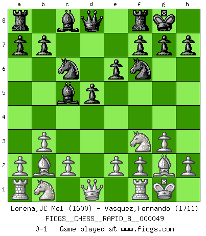 Last move : 0-1 2007 June 9 6:49:23 [Event "FICGS__CHESS__RAPID_B__000049"] [Site "FICGS"] [Date "2007.04.25"] [Round "1"] [White "Lorena,JC Mei"] [Black "Vasquez,Fernando"] [Result "0-1"] [WhiteElo "1600"] [BlackElo "1711"] 1.Nf3 Nf6 2.b3 d5 3.Bb2 e6 4.g3 Be7 5.Bg2 O-O 6.O-O c5 7.d4 Nc6 8.dxc5 Bxc5 0-1 This chess game has been lost on time (started : 2007.04.25 15:52:58) Reti Opening Kingside Castling by player Black (move 5) Kingside Castling by player White (move 6) Player Black won this chess game. Follow this game move after move (download)I am the best player in the world and I am here to prove it. (Bobby Fischer) Im Fernschach kannst du während dem Spiel rauchen. (John Christen Knudsen) Tu no necesitas jugar muy bien, únicamente ayudar a tu oponenet a que juegue muy mal. (Genrikh Chepukaitis) Avant la finale, les dieux ont créé le milieu de partie. (Tarrasch) Heh, heh, heh. Time to abandon ship. (General Grievous in Star Wars ep.3)
