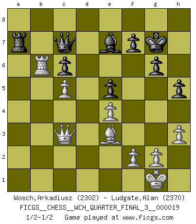 Last move : 1/2-1/2 2018 May 10 15:43:52 [Event "FICGS__CHESS__WCH_QUARTER_FINAL_3__000019"] [Site "FICGS"] [Date "2018.03.02"] [Round "8"] [White "Wosch,Arkadiusz"] [Black "Ludgate,Alan"] [Result "1/2-1/2"] [WhiteElo "2302"] [BlackElo "2370"] 1.d4 d6 2.e4 Nf6 3.Nc3 g6 4.Nf3 Bg7 5.Be2 O-O 6.O-O c6 7.a4 Qc7 8.h3 e5 9.Re1 Nbd7 10.dxe5 dxe5 11.Be3 Re8 12.a5 Bf8 13.Bc4 Nc5 14.Ng5 Ne6 15.Bxe6 Bxe6 16.Qf3 Kg7 17.Nxe6+ Rxe6 18.Na4 Nd7 19.Red1 Rd6 20.Rdb1 b5 21.axb6 axb6 22.c4 Re6 23.Qe2 R6e8 24.b4 Reb8 25.Qc2 b5 26.cxb5 Rxb5 27.Nc5 Rxa1 28.Rxa1 Nxc5 29.bxc5 Ra5 30.Rb1 h5 31.Qc3 Be7 32.Rb6 Ra7 1/2-1/2 Queen's Pawn Kingside Castling by player Black (move 5) Kingside Castling by player White (move 6) This chess game ended in a draw. Follow this game move after move (download)The mistakes are there, waiting to be made. (Savielly Tartakower) Nicht daß Diemer aus Opportunismus Mitglied der NSDAP geworden wäre. Er war ein Fanatiker, in allem, was er tat. (Hans Ree) El Ajedrez tiene tanto misterio como las mujeres. (Purdy) J'ai toujours senti une vague pitié pour l'homme qui ne connaît rien aux échecs, tout comme j'en aurais pour un homme ignorant de l'amour. Les Echecs, comme la musique ou comme l'amour, ont le pouvoir de rendre heureux. (Siegbert Tarrasch) Life is like a play: it's not the length but the excellence of the acting that matters. (Seneca)