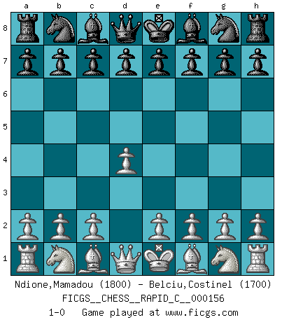 Last move : 1-0 2018 May 7 22:43:4 [Event "FICGS__CHESS__RAPID_C__000156"] [Site "FICGS"] [Date "2018.04.05"] [Round "1"] [White "Ndione,Mamadou"] [Black "Belciu,Costinel"] [Result "1-0"] [WhiteElo "1800"] [BlackElo "1700"] 1.d4 1-0 This chess game has been lost on time (started : 2018.04.05 16:7:24) Queen's pawn Player White won this chess game. Follow this game move after move (download)In the perfect Chess combination as in a first-rate short story, the whole plot and counter-plot should lead up to a striking finale, the interest not being allayed until the very last moment. (Yates and Winter) Wenn man heute mit 14 Jahren noch kein GM ist, kann man es vergessen. (Viswanathan Anand) A través de las casillas del tablero, los Indios explican el movimiento del tiempo y la edad, las influencias mas altas que controlan el mundo y los lazos que vinculan al Ajedrez con el alma humana. (Al-Masudi) Nous vivons dans un monde échiquéen : chaque jour qui passe est un défi à relever. (Philosophe Sasha) Don't be discouraged. It's often the last key in the bunch that opens the lock. (Author unknown)