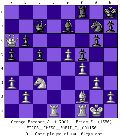 Last move : 1-0 2018 June 1 12:33:48 [Event "FICGS__CHESS__RAPID_C__000156"] [Site "FICGS"] [Date "2018.04.05"] [Round "1"] [White "Arango Escobar,Jesus Eduardo"] [Black "Price,Eric"] [Result "1-0"] [WhiteElo "1700"] [BlackElo "1586"] 1.c4 Nf6 2.Nf3 e6 3.d4 b6 4.g3 Ba6 5.Qc2 Bb7 6.Bg2 Bb4+ 7.Bd2 Be7 8.O-O O-O 9.Nc3 d5 10.cxd5 exd5 11.Rad1 Nbd7 12.Bf4 c6 13.a3 a5 14.Ne5 Nxe5 15.dxe5 Nh5 16.Be3 g6 17.f4 Ng7 18.Na4 Ra6 19.Bf2 Qc7 20.e4 dxe4 21.Bxe4 c5 22.Nc3 Bxe4 23.Qxe4 f5 24.Qc4+ Kh8 25.Qxa6 1-0 English Opening Kingside Castling by player White (move 8) Kingside Castling by player Black (move 8) Player White won this chess game. Follow this game move after move (download)Pawns: they are the soul of this game, they alone form the attack and defense. (Philidor) Stil? Ich habe keinen Stil! (Anatoly Karpov) El Ajedrez tiene tanto misterio como las mujeres. (Purdy) Le profane ne songe pas à la somme de jouissance dont il se prive, qui méconnaît ce jeu aux ressources aussi variées que passionnantes. (Jean-Marie Jeanton-Lamarche) We need strong personalities and only one world champion to attract sponsors. (Anatoly Karpov)