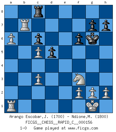 Last move : 1-0 2018 May 13 15:52:29 [Event "FICGS__CHESS__RAPID_C__000156"] [Site "FICGS"] [Date "2018.04.05"] [Round "1"] [White "Arango Escobar,Jesus Eduardo"] [Black "Ndione,Mamadou"] [Result "1-0"] [WhiteElo "1700"] [BlackElo "1800"] 1.c4 b5 2.cxb5 a6 3.e3 Bb7 4.Nf3 f6 5.Nc3 axb5 6.Bxb5 c6 7.Be2 Nh6 8.O-O d5 9.d4 Nf7 10.e4 e6 11.Re1 Bb4 12.exd5 exd5 13.Qb3 Bxc3 14.bxc3 Qc7 15.Ba6 Kf8 16.Ba3+ Nd6 17.Qxb7 Qxb7 18.Bxd6+ Kf7 19.Bxb7 Ra7 20.Re7+ Kg6 21.a4 Rd8 22.Bc5 Rxb7 23.Rxb7 Nd7 24.a5 Nxc5 25.dxc5 Rc8 26.a6 1-0 English : Jaenisch gambit Kingside Castling by player White (move 8) Player White won this chess game. Follow this game move after move (download)Chess is not like life... it has rules ! (Mark Pasternak) Um sich vor der Gefahr einer Erkältung zu schützen, sorge der wanderlustige König beizeiten für ein brauchbares Versteck. (Aaron Nimzowitsch) Tu cuerpo tiene que estar en óptima condición. Tu Ajedrez se deteriora como lo hace tu cuerpo. No puedes separar la mente y el cuerpo. (Bobby Fischer) Le système Elo représente seulement une moyenne. Il est simplement un indicateur de votre stabilité. (Anatoli Karpov) Philosophers use a language that is already deformed as though by shoes that are too tight. (Ludwig Wittgenstein)