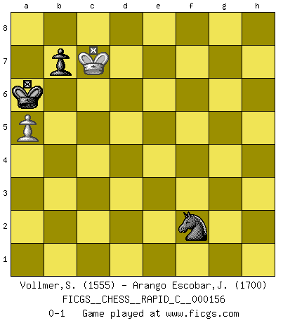 Last move : 0-1 2018 May 12 12:3:56 [Event "FICGS__CHESS__RAPID_C__000156"] [Site "FICGS"] [Date "2018.04.05"] [Round "1"] [White "Vollmer,Steve"] [Black "Arango Escobar,Jesus Eduardo"] [Result "0-1"] [WhiteElo "1555"] [BlackElo "1700"] 1.e4 c6 2.d4 d5 3.Nc3 dxe4 4.Nxe4 Bf5 5.Ng3 Bg6 6.Nf3 Nd7 7.Bd3 Bxd3 8.Qxd3 Ngf6 9.O-O e6 10.c4 Be7 11.b3 O-O 12.Bb2 a5 13.a3 Qc7 14.Rad1 Bd6 15.Ne4 Nxe4 16.Qxe4 Nf6 17.Qc2 Rfd8 18.h3 Qe7 19.a4 Bb4 20.Ne5 Nd7 21.Nd3 c5 22.Nxb4 cxb4 23.Rfe1 Nf8 24.d5 Qc5 25.Bd4 Qc7 26.Qb2 f6 27.dxe6 Re8 28.Be3 Rxe6 29.Qd2 Rae8 30.Qd5 R8e7 31.c5 Ng6 32.Qd8+ Kf7 33.Qxc7 Rxc7 34.Rd6 Re4 35.Red1 Ne5 36.g3 h5 37.Kg2 Re7 38.R1d4 Rxd4 39.Bxd4 Nc6 40.Be3 Ne5 41.Rd8 Rd7 42.Rxd7+ Nxd7 43.f4 Ke6 44.Kf3 f5 45.g4 hxg4+ 46.hxg4 g6 47.Kg3 Kd5 48.gxf5 gxf5 49.Kh4 Ke4 50.Bf2 Kxf4 51.Bg3+ Ke4 52.Bc7 Nxc5 53.Bxa5 Nxb3 54.Bxb4 f4 55.Kh3 f3 56.Kg3 Ke3 57.Be1 Ke2 58.Bf2 Nc1 59.Bd4 Nd3 60.a5 f2 61.Bxf2 Nxf2 62.Kf4 Kd3 63.Ke5 Kc4 64.Kd6 Kb5 65.Kc7 Ka6 0-1 Caro-Kann : Classical variation Kingside Castling by player White (move 9) Kingside Castling by player Black (move 11) 10 pieces endgame at move 52 : White KBPP , Black KNPPPP WHITE : King + 1 Bishop 2 Pawns BLACK : King + 1 Knight 4 Pawns 9 pieces endgame at move 53 : White KBPP , Black KNPPP WHITE : King + 1 Bishop 2 Pawns BLACK : King + 1 Knight 3 Pawns 8 pieces endgame at move 53 : White KBP , Black KNPPP WHITE : King + 1 Bishop 1 Pawn BLACK : King + 1 Knight 3 Pawns 7 pieces endgame at move 54 : White KBP , Black KNPP WHITE : King + 1 Bishop 1 Pawn BLACK : King + 1 Knight 2 Pawns 6 pieces endgame at move 61 : White KBP , Black KNP WHITE : King + 1 Bishop 1 Pawn BLACK : King + 1 Knight 1 Pawn 5 pieces endgame at move 61 : White KP , Black KNP WHITE : King + 1 Pawn BLACK : King + 1 Knight 1 Pawn Player Black won this chess game. Follow this game move after move (download)If a ruler does not understand Chess, how can he rule over a kingdom ? (King Khusros II) Der vorletzte Fehler gewinnt. (Savielly Grigorievitsch Tartakower) No soy una persona materialista y por eso, no resiento la falta o pérdida del dinero. La ausencia de cosas mundanas carece de importancia. Ya que el Ajedrez es una forma en la que puedo ser tan materialista como yo desee sin tener la necesidad de vender mi alma. (Jamie Walter Adams) Le temps de noter son nom sur la feuille de partie, j'étais déjà en zeitnot ! D'un modeste amateur apparié lors de la première ronde d'un open contre le grand-maître Azmaïparashvili. If only faces could talk... (Pat Summerall, Sportscaster during the Super Bowl)