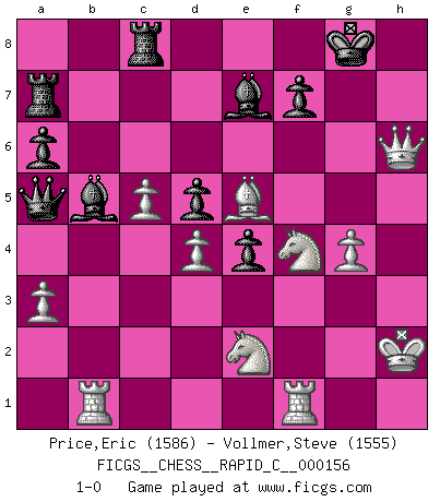 Last move : 1-0 2018 April 15 12:39:25 [Event "FICGS__CHESS__RAPID_C__000156"] [Site "FICGS"] [Date "2018.03.02"] [Round "1"] [White "Price,Eric"] [Black "Vollmer,Steve"] [Result "1-0"] [WhiteElo "1586"] [BlackElo "1555"] 1.d4 d5 2.c4 e6 3.Nc3 Nf6 4.Nf3 c5 5.e3 Nc6 6.a3 cxd4 7.exd4 Be7 8.Bd3 O-O 9.O-O a6 10.c5 b6 11.b4 bxc5 12.bxc5 Bd7 13.Bf4 Qa5 14.Qc2 h6 15.h3 Rfc8 16.g4 Qd8 17.Ne2 Be8 18.Kh2 Nd7 19.Qd2 g5 20.Bg3 e5 21.Bf5 e4 22.Ne1 Bf6 23.Rb1 Ra7 24.Ng2 Qa5 25.Qe3 Ne7 26.f4 Nxf5 27.gxf5 Be7 28.fxg5 hxg5 29.f6 Nxf6 30.Qxg5+ Kf8 31.Qh6+ Kg8 32.Be5 Bb5 33.Ngf4 Ng4+ 34.hxg4 1-0 QGD : Semi-Tarrasch defense Kingside Castling by player Black (move 8) Kingside Castling by player White (move 9) Player White won this chess game. Follow this game move after move (download)Life is a kind of Chess, with struggle, competition, good and ill events. (Benjamin Franklin) Ein unbeabsichtigtes Patt ist der Gipfel der Dummheit. (Anonymous) Una buena memoria, concentración, imaginación y una fuerte voluntad, se requiere para llegar a ser un buen jugador. (Bobby Fischer) Ce n'est pas pour s'amuser qu'il joue aux échecs : il célèbre un culte. (Vladimir Nabokov) Bobby never cared about money, though. His only desire was to prove that his choices were correct: He wanted chess to be important because he was a chess player, and he wanted to be important. Bobby knew money was important, but he didn't have a clue why, outside of clothes and status. The only way he could accomplish what he wanted was to fight for a lot of money. Once he got it, he gave it away. He did not know how to spend it. And once he'd become champion, after, essentially, sacrificing his life for it, he didn't know how to spend his time. (Bob Wade)