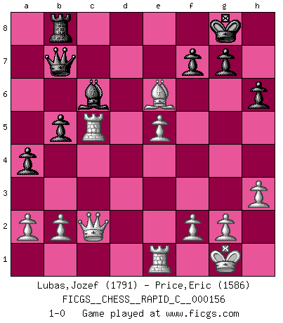 Last move : 1-0 2018 March 17 19:45:8 [Event "FICGS__CHESS__RAPID_C__000156"] [Site "FICGS"] [Date "2018.03.02"] [Round "1"] [White "Lubas,Jozef"] [Black "Price,Eric"] [Result "1-0"] [WhiteElo "1791"] [BlackElo "1586"] 1.e4 e5 2.Nf3 Nc6 3.Bb5 a6 4.Ba4 Nf6 5.O-O Be7 6.Re1 b5 7.Bb3 d6 8.c3 O-O 9.h3 Na5 10.Bc2 c5 11.d4 Qc7 12.Nbd2 cxd4 13.cxd4 Nc6 14.Nb3 a5 15.Be3 a4 16.Nbd2 Bd7 17.Rc1 Qb7 18.Qe2 Rfe8 19.Bd3 Rab8 20.dxe5 Nxe5 21.Nxe5 dxe5 22.Bc5 Bc6 23.Bxe7 Rxe7 24.Nf3 h6 25.Rc5 Re6 26.Nxe5 Nd7 27.Nxd7 Qxd7 28.e5 Qd4 29.Qc2 Qd7 30.Bf5 Qb7 31.Bxe6 1-0 Ruy Lopez : Closed Kingside Castling by player White (move 5) Kingside Castling by player Black (move 8) Player White won this chess game. Follow this game move after move (download)The boy (then a 12 year old boy named Anatoly Karpov) doesn't have a clue about Chess, and there's no future at all for him in this profession. (Mikhail Botvinnik) Bis jetzt ist Weiß einer wohlbekannten Analyse gefolgt. Aber jetzt begeht er einen schrecklichen Fehler: Er beginnt seinen eigenen Kopf zu benutzen. (Siegbert Tarrasch) Prefiero perder una partida realmente buena, que ganar una mala. (David Levy) Vous savez, camarade Pachman, je n'éprouve pas de plaisir à être ministre, je jouerais plutôt aux échecs comme vous, ou alors ferais une révolution au Venezuela. (Che Guevara à Ludek Pachman, 'Checkmate in Prague', 1975) When I took office, only high energy physicists had ever heard of what is called the World Wide Web... Now even my cat has its own page. (Bill Clinton, 1996)